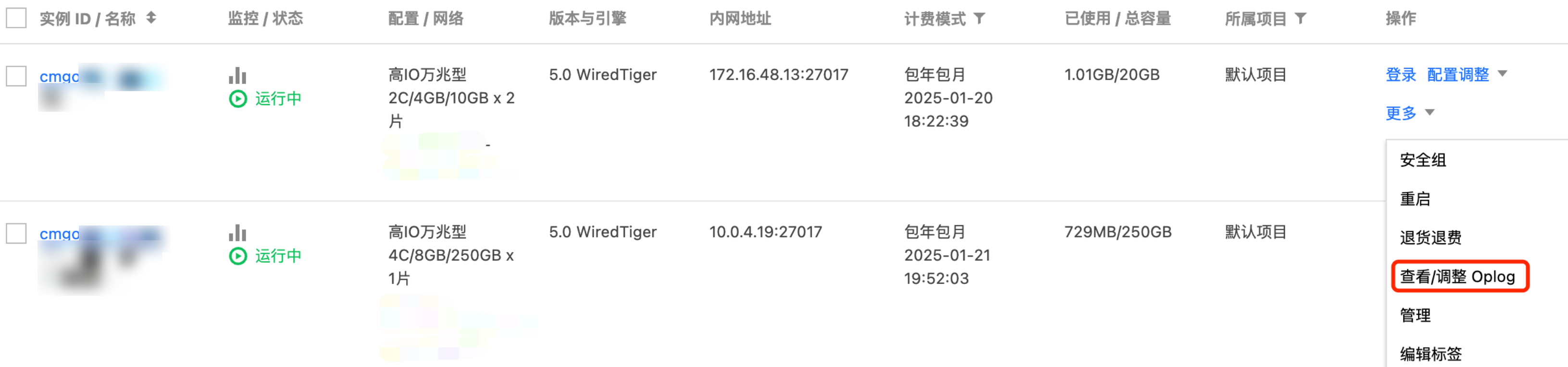 5. 在操作列,选择更多 > 查看/调整 Oplog。