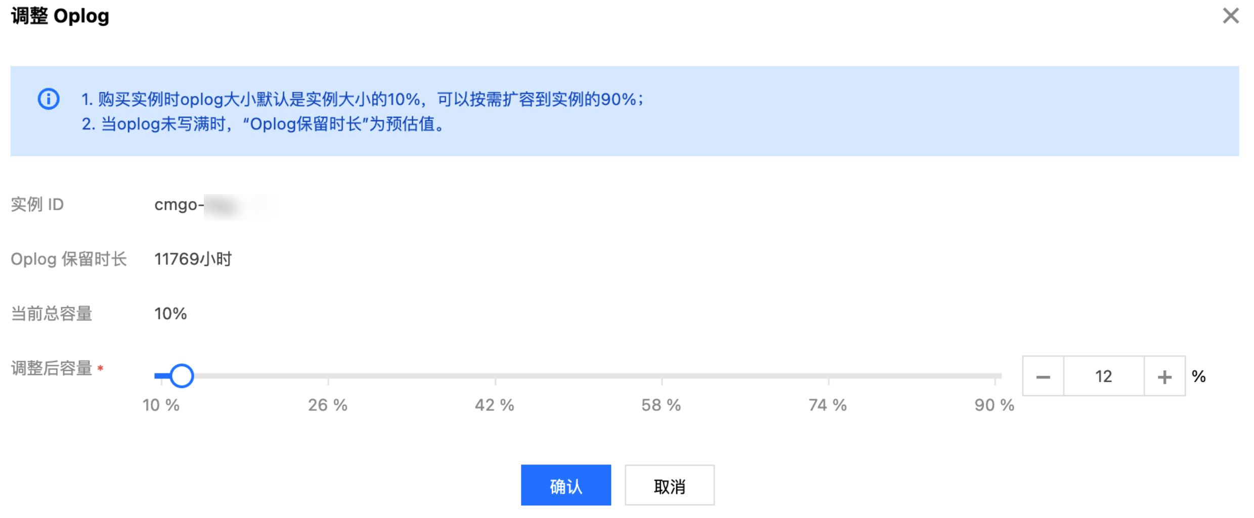 6. 在调整 Oplog 的对话框,确认实例信息,根据当前 Oplog 的容量,评估需调整的容量。
