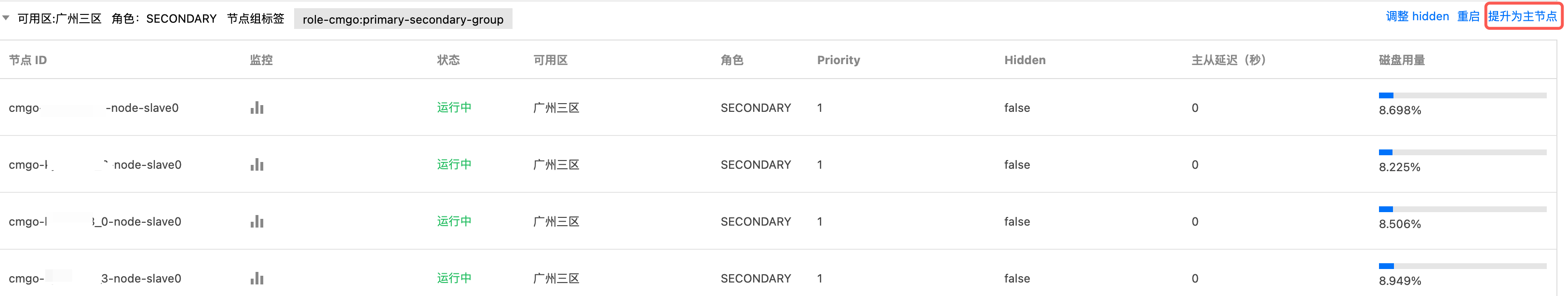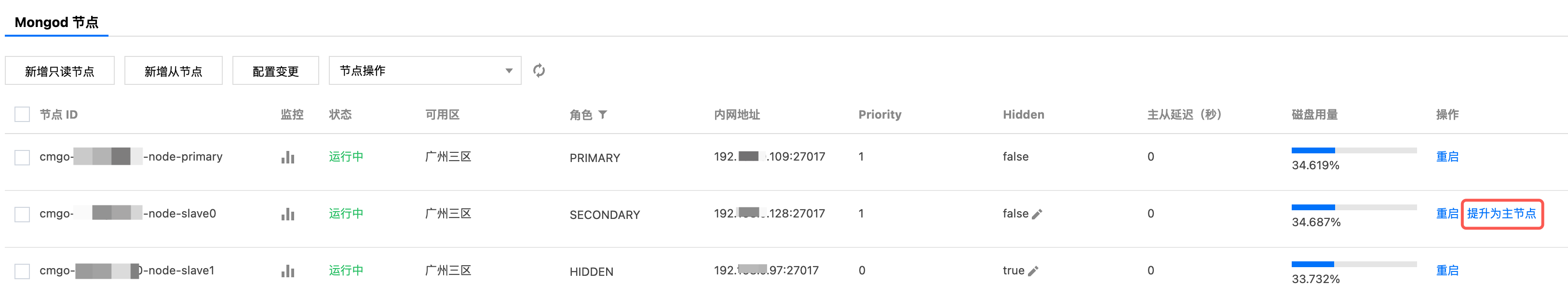 副本集:在节点列表,找到需升主的从节点,单击其操作列的提升为主节点。