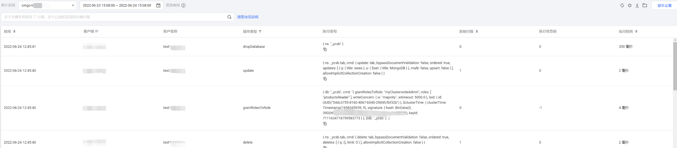 开通了数据库审计服务后,系统开始记录云数据库 MongoDB 的相关操作。您可以随时查看数据库的审计日志信息,包含数据库请求访问时间、客户端 IP、账户名称、执行语句、执行语句所消耗的时间等。