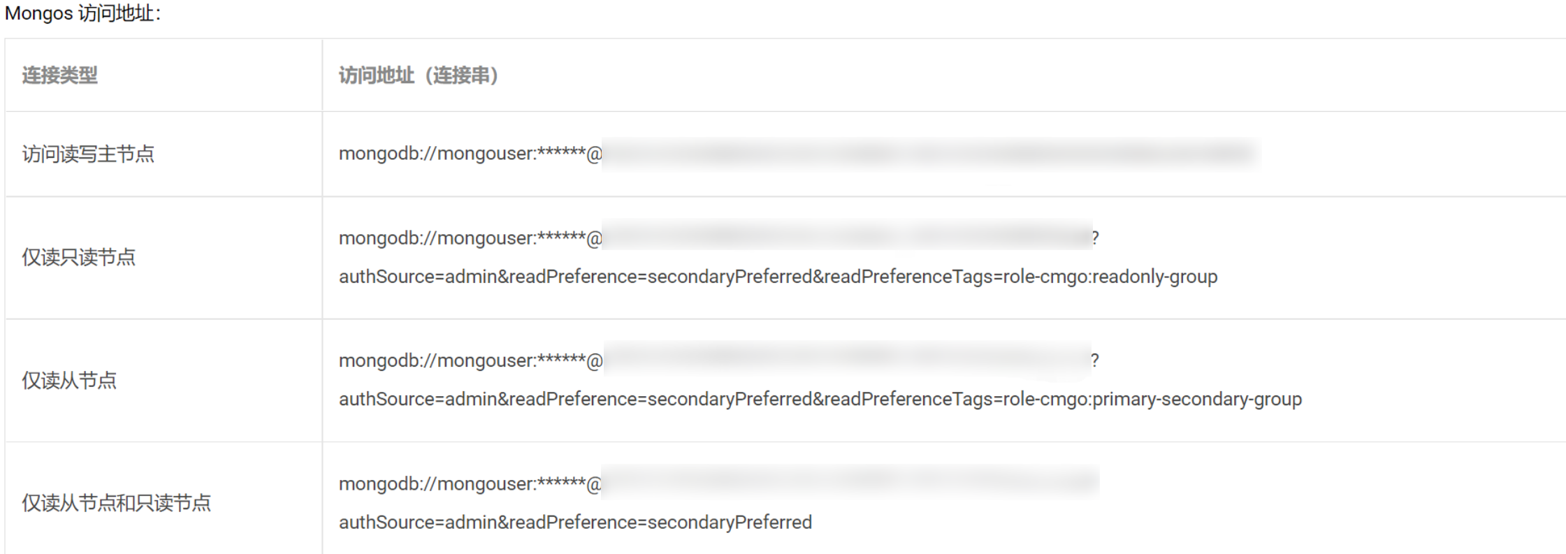 开通之后,在控制台实例详情页面的网络配置区域的访问地址中,可查看 Mongos 访问地址,展示不同连接类型的连接串。每一个连接串中配置了实例所有 Mongos 节点,通过参数 authSource、 readPreference 与 readPreferenceTags 控制访问节点类型,如下图所示。