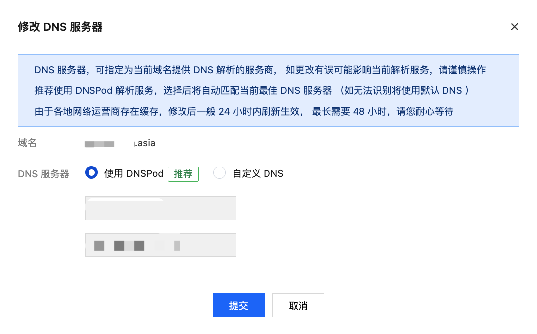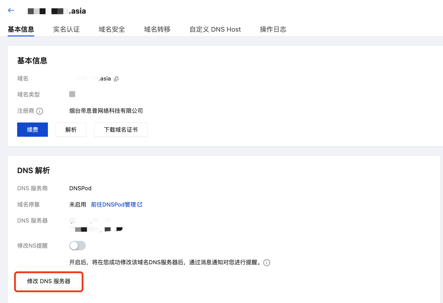 如果域名在腾讯云注册,或者已转入腾讯云,可以通过以下步骤修改 DNS 服务器: