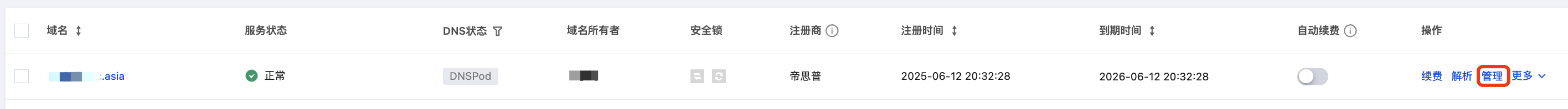 2. 选择需要修改 DNS 服务器的域名,单击管理。如下图所示: