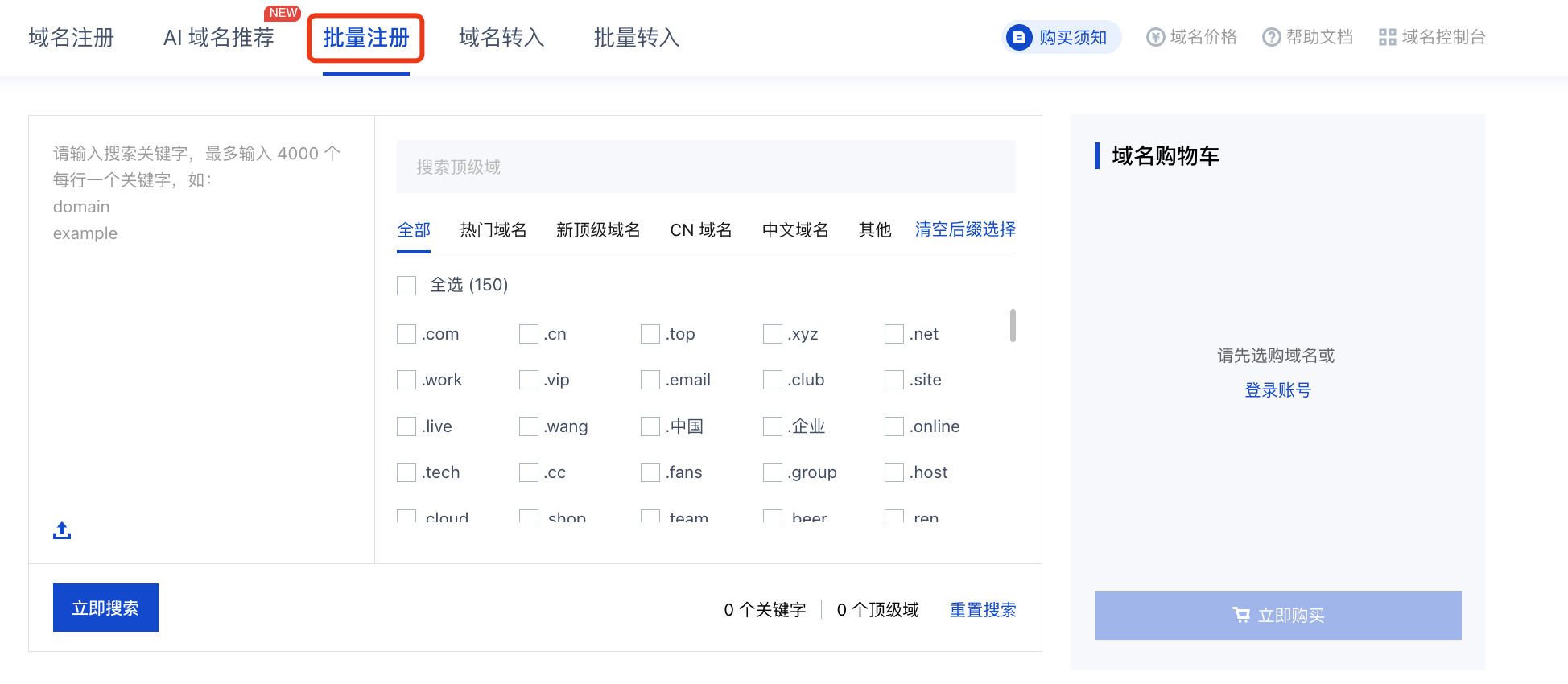 1. 登录 域名注册 页面,在域名注册页面,单击批量注册,即可打开批量注册页面。如下图所示:
