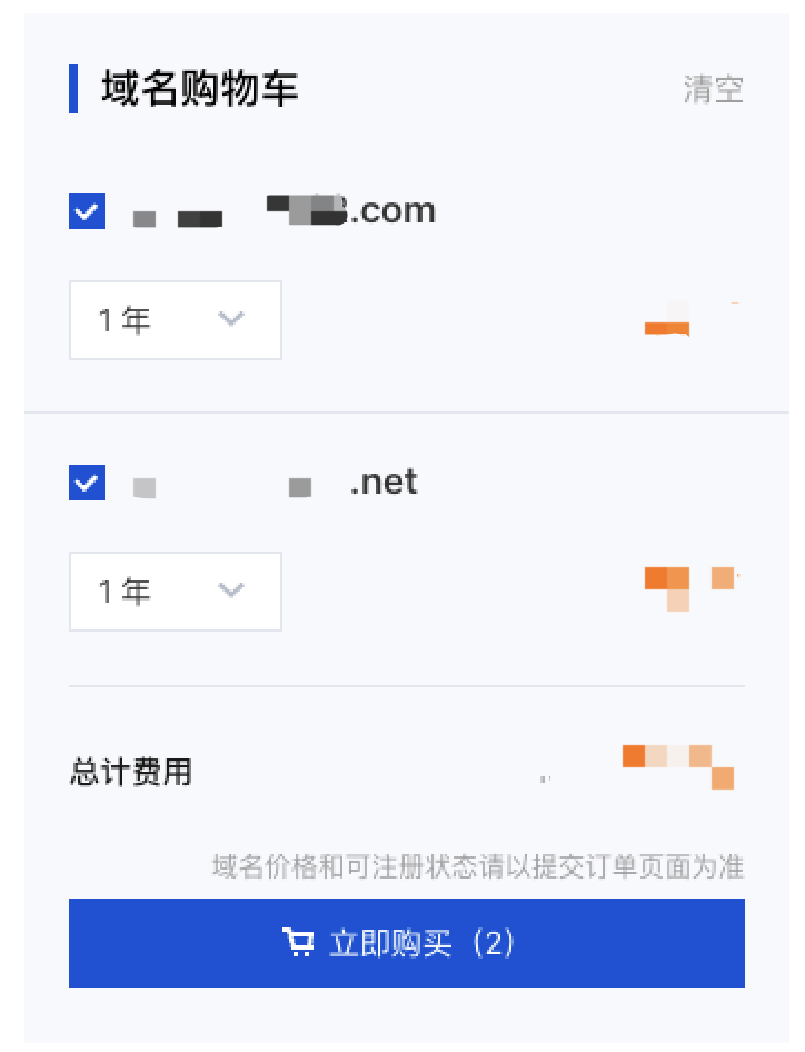 2. 在右侧的域名购物车中,单击立即购买。如下图所示: