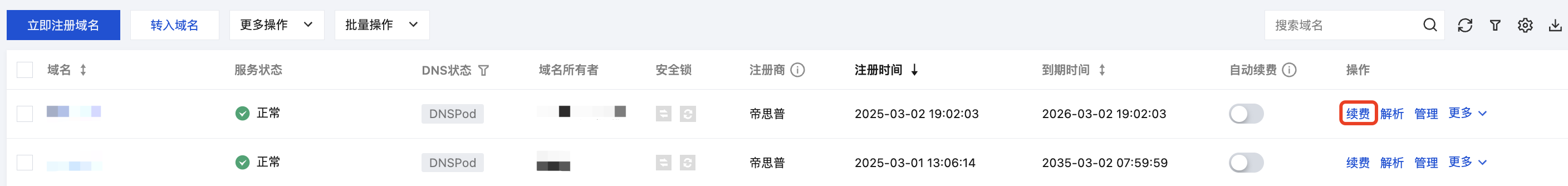 在需要续费域名行中,单击续费,即可提交续费申请,如下图所示: