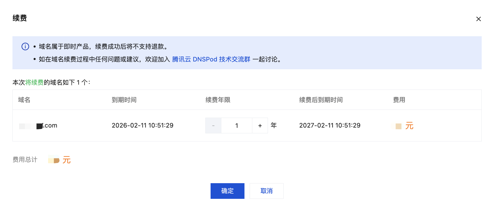 正在使用腾讯云解析的域名将于续费成功后的 24 - 48 小时内恢复解析。