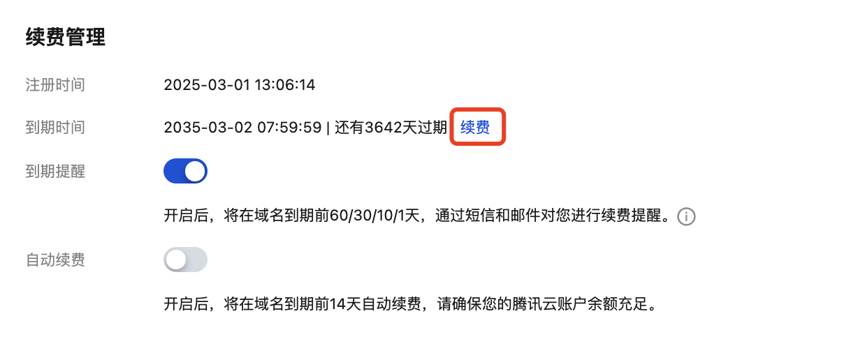 在域名到期前,腾讯云会发出邮件或短信提醒,为保障您的域名能正常运行,本文指导您对已注册域名延长有效使用期限。您也可以根据实际需求进行续费操作。