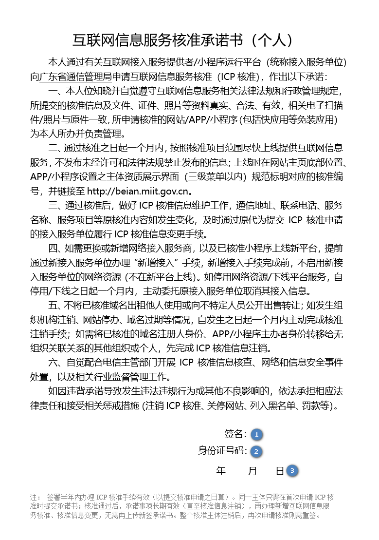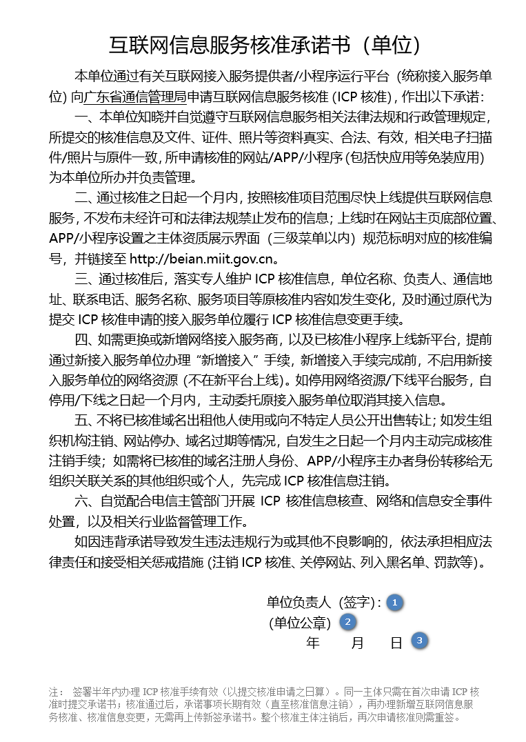 广东省互联网信息服务核准承诺书必须主体负责人本人填写日期和签字(需手写正楷签名,接受签名章,不接受连笔签)。
