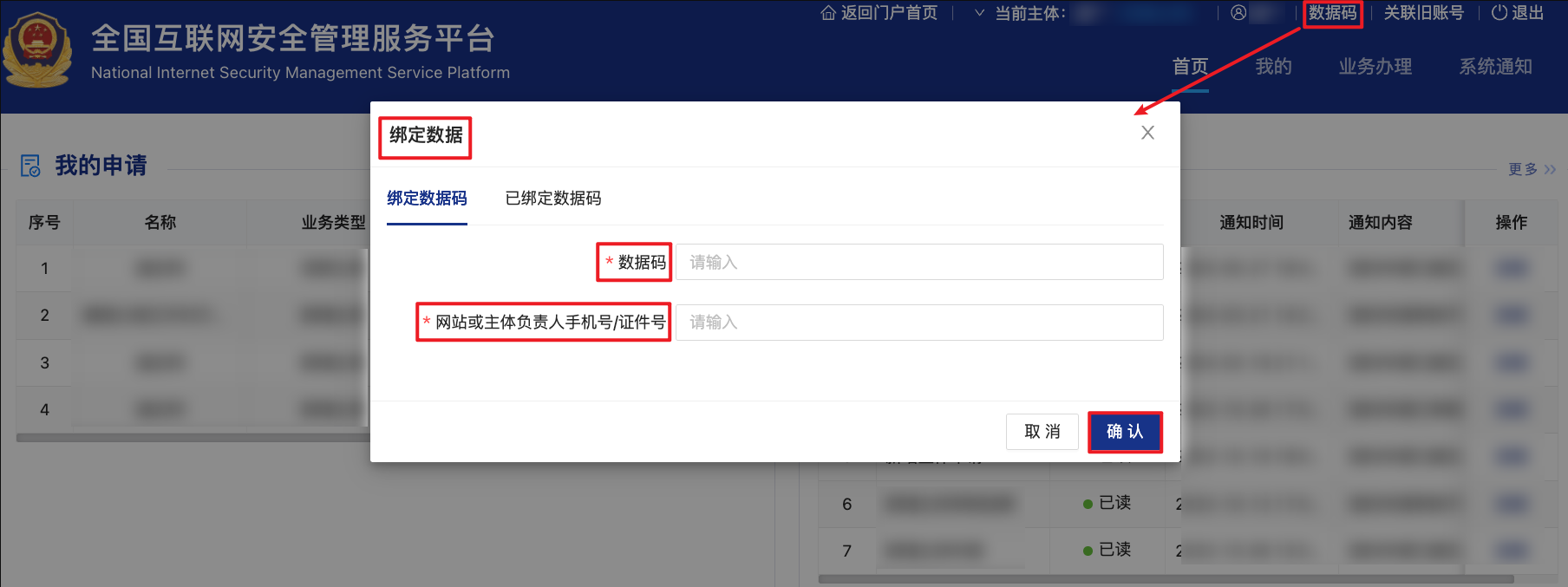 1. 支持用户查看已绑定数据码。登录 全国互联网安全管理服务平台,单击页面右上角数据码,弹出绑定数据对话框,选择已绑定数据码页签查看已绑定数据码列表。