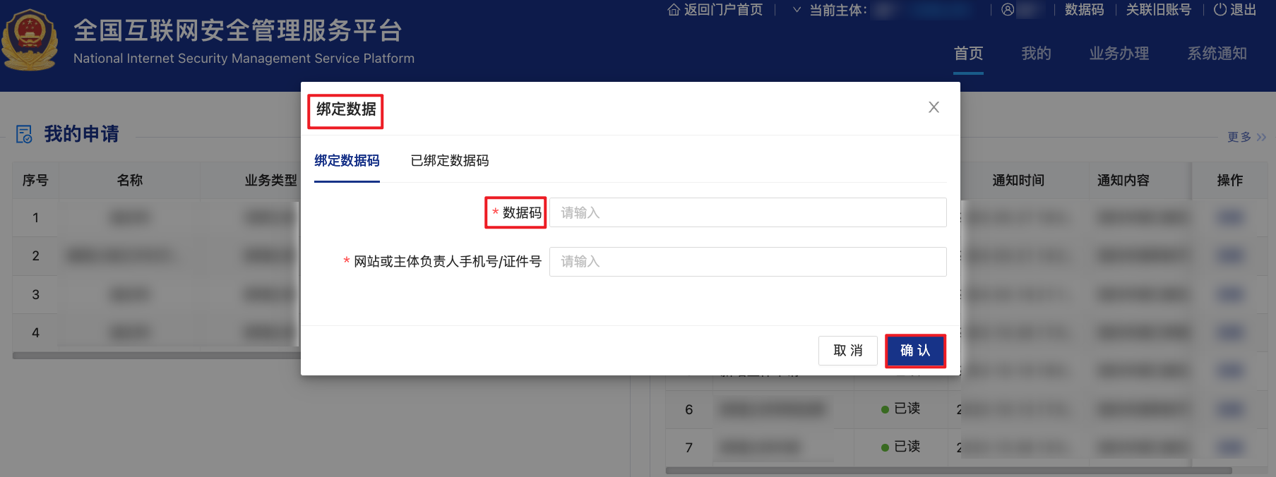 1. 进入 全国互联网安全管理服务平台 > 首页,系统会自动检测您当前登录账号信息与服务商发送的数据码的匹配关系: