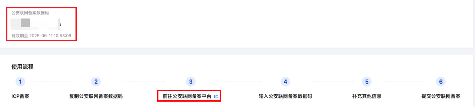 2. 在公安联网备案页面,您可以查看本次订单的公安联网备案数据码;单击前往公安联网备案平台,进入 全国互联网安全管理服务平台 页面,输入数据码并补充公安联网备案信息即可提交公安联网备案审核。