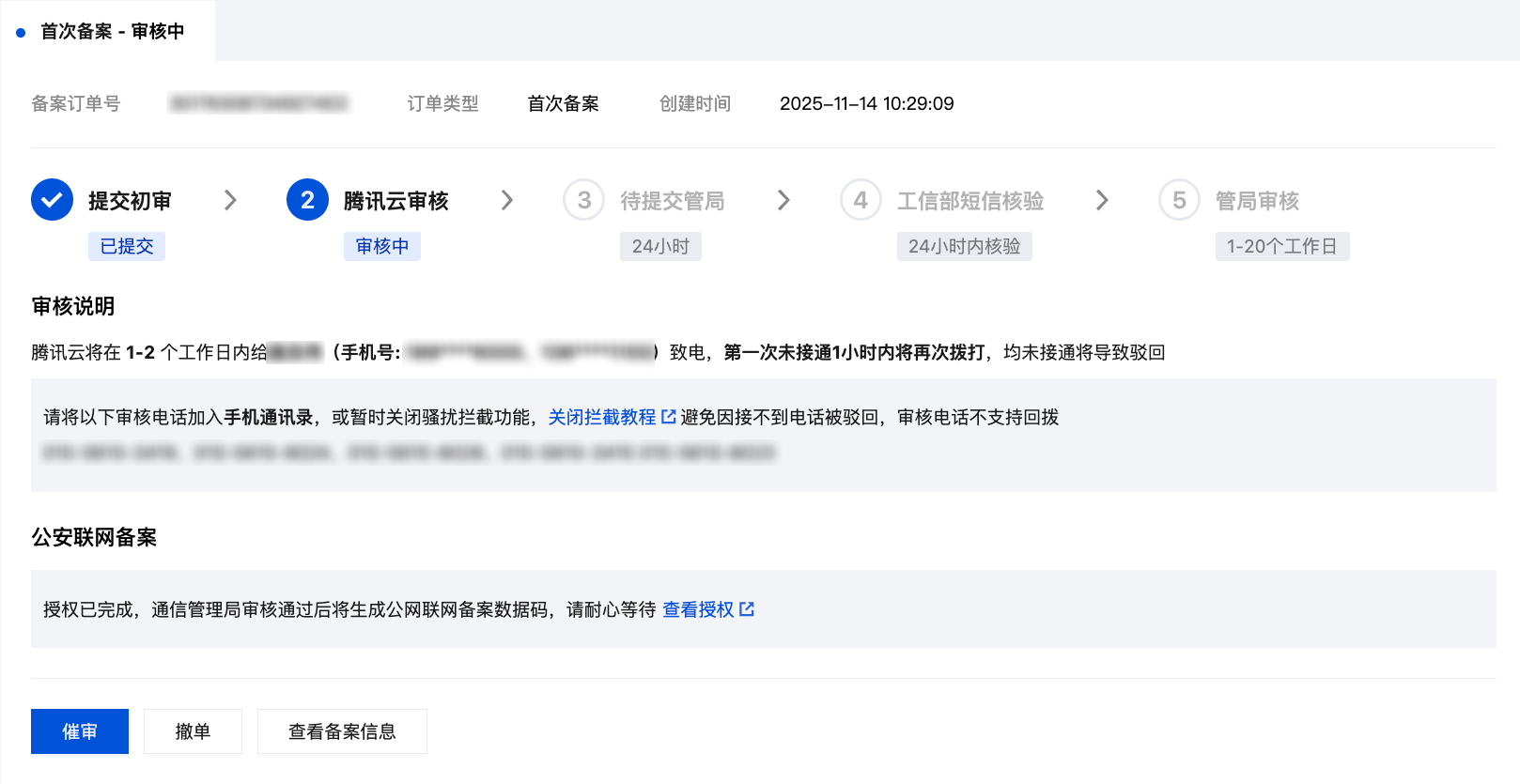 4. 腾讯云初审通过后,进入管局审核流程,管局审核时会发送工信部的核验短信,当您收到短信后,请参见 备案工信部短信核验说明 进行操作。