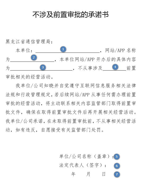 ![]() | 1. 请填写备案单位名称。 2. 请填写备案网站/APP 服务名称。 3. 请填写备案服务(网站/APP)开展服务内容。 4. 请填写不涉及前置审批项(注:新闻、出版、药品和医疗器械、文化、广播电影电视节目、网络游戏等前置审批项)。 5. 请签字加盖单位公章(鲜章)。 6. 请法定代表人签字。 7. 请在日期处填写签署文件的日期。 |