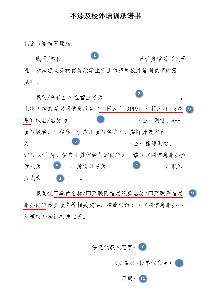![]() | 1. 填写单位名称。 2. 填写单位主要经营业务。 3. 选择互联网信息服务。 4. 填写所需备案的互联网信息服务域名/名称(注:网站、APP 填写域名,小程序、快应用填写名称)。 5. 填写备案服务(网站/APP)开展业务内容。 6. 填写互联网信息服务负责人姓名。 7. 填写互联网信息服务负责人身份证号码。 8. 填写互联网信息服务负责人手机号码。 9. 根据实际情况进行勾选。 10. 法定代表人签字。 11. 加盖企业鲜章。 12. 填写签署日期。 |