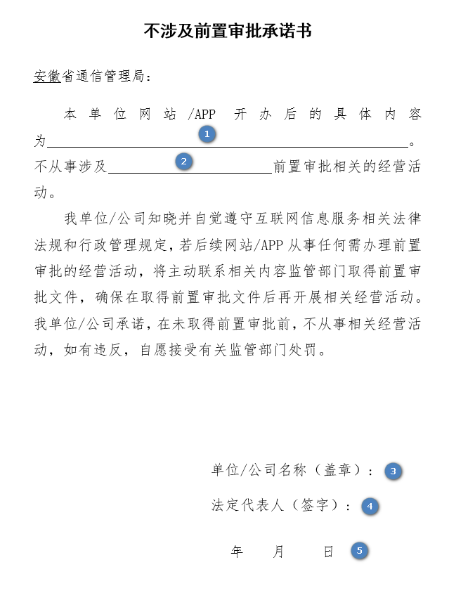 ![]() | 1. 请填写备案服务(网站/APP)开展服务内容。 2. 请填写不涉及前置审批项(注:新闻、出版、药品和医疗器械、文化、广播电影电视节目、网络游戏等前置审批项)。 3. 请签字加盖单位公章(鲜章)。 4. 请法定代表人签字。 5. 请在日期处填写签署文件的日期。 |