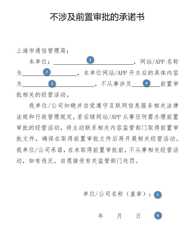 ![]() | 1. 请填写备案单位名称。 2. 请填写备案网站/APP 服务名称。 3. 请填写备案服务(网站/APP)开展服务内容。 4. 请填写不涉及前置审批项(注:新闻、出版、药品和医疗器械、文化、广播电影电视节目、网络游戏等前置审批项)。 5. 请签字加盖单位公章(鲜章)。 6. 请在日期处填写签署文件的日期。 |