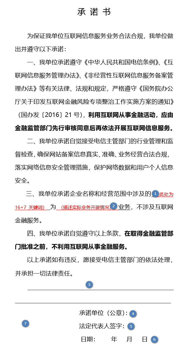 ![]() | 1. 请填写单位名称和经营范围中涉及金融类的具体关键词(例如:金融、投资管理、保险、基金、支付、交易所、交易中心等)。 2. 请填写实际开办业务内容详情。 3. 请手抄第四项中的文字。 4. 请加盖单位公章(鲜章)。 5. 请法定代表人签字。 6. 在日期处填写签署文件的日期。 7. 请在承诺书空白处注明:负责人咨询金融部门、咨询电话及咨询结果。 |