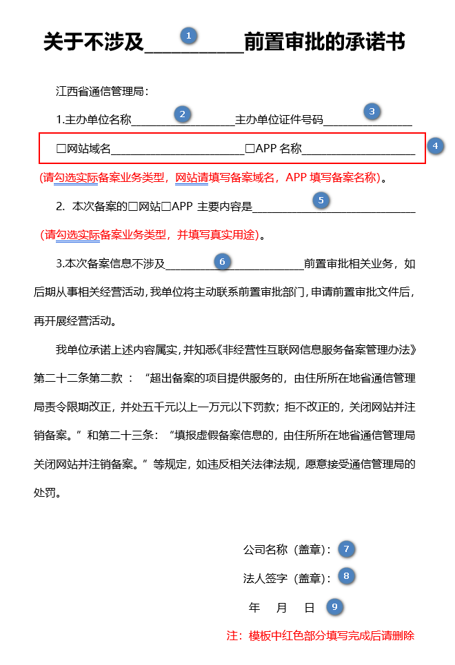 ![]() | 1. 请填写不涉及前置审批项(注:新闻、出版、药品和医疗器械、文化、广播电影电视节目、网络游戏等前置审批项)。 2. 请填写主办单位名称。 3. 请填写统一社会信用代码。 4. 请填写网站域名/APP 名称(按照 ICP 备案应用服务类型选择对应网站/APP 应用服务类型,并在横线位置处填写网站域名/APP 名称)。 5. 请填写备案服务内容(按照 ICP 备案应用服务类型选择对应类型并在横线上填写对应网站或 APP 开展的业务内容进行说明。) 6. 请填写不涉及前置审批项。 7. 请签字加盖单位公章(鲜章)。 8. 请法定代表人签字盖章。 9. 请在日期处填写签署文件的日期。 |