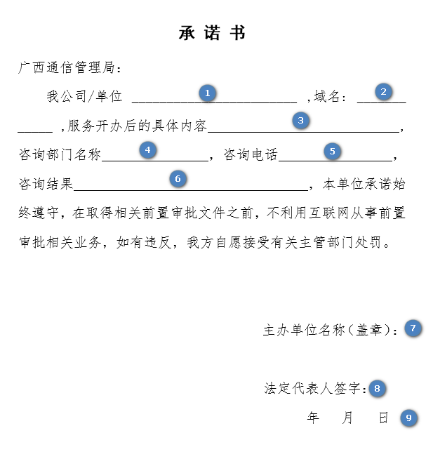 ![]() | 1. 填写备案省份。 2. 填写企业或单位全称。 3. 填写营业执照统一社会信用代码。 4. 填写备案的二级域名。 5. 填写服务名称。 6. 填写服务实际内容。 7. 填写企业全称并加盖企业鲜章。 8. 法定代表人签字。 9. 签署日期。 |