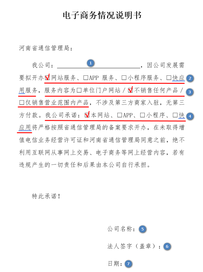 ![]() | 1. 公司名称。 2. 根据实际情况勾选 ICP 备案应用服务类型(本示例为网站服务)。 3. 根据开展业务勾选服务内容(本示例为不销售任何产品)。 4. 根据实际情况勾选 ICP 备案应用服务类型(本示例为本网站)。 5. 公司名称。 6. 法定代表人签字。 7. 签署日期。 |