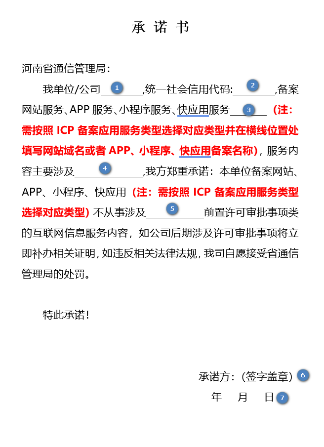 ![]() | 1. 请填写单位/公司名称。 2. 请填写统一社会信用代码。 3. 请填写备案服务名称(需按照 ICP 备案应用服务类型选择对应类型并在横线位置处填写网站域名或者 APP、小程序、快应用备案名称)。 4. 请填写备案服务内容(需按照 ICP 备案应用服务类型选择对应类型)。 5. 请填写不涉及的相关前置审批信息。 6. 请签字加盖单位公章(鲜章)。 7. 请在日期处填写签署文件的日期。 注意: 填写完成后,请删除模板中红色部分内容。 |