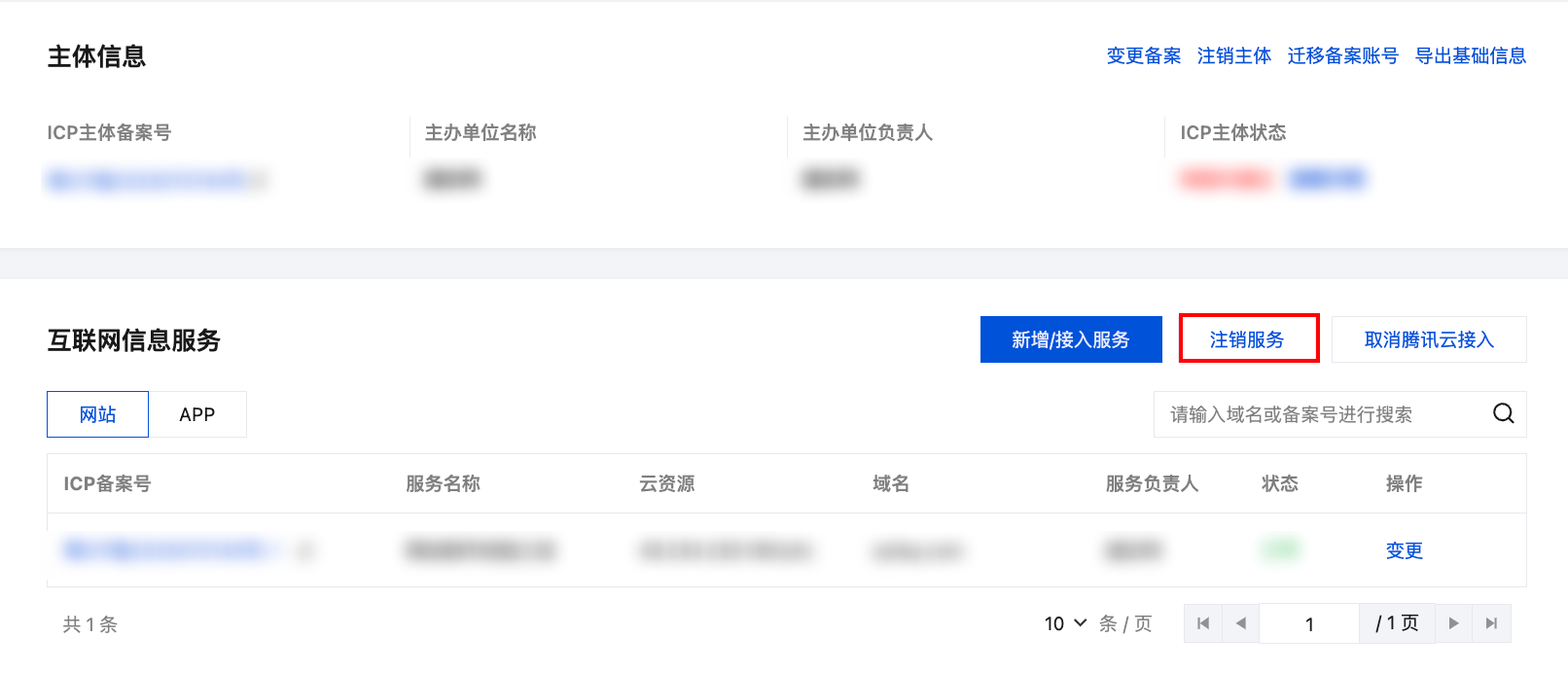 2. 在我的备案页面,单击注销服务,如下图所示: