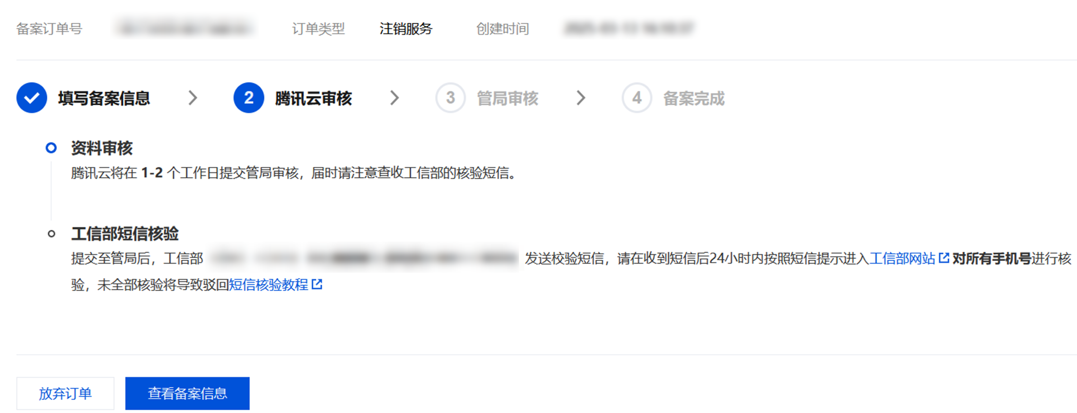 8. 注销服务由腾讯云自动审核进入管局审核阶段后,进入工信部短信核验步骤。