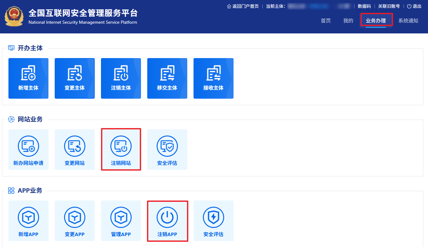 1. 登录 全国互联网安全管理服务平台,单击业务办理 > 注销网站/注销 APP,进入网站/APP 列表页面,列表数据为当前用户所有已经申请备案的网站/APP数据,已经审核通过的网站/APP 在该页面的操作列将显示注销按钮,单击注销按钮,发起注销流程。