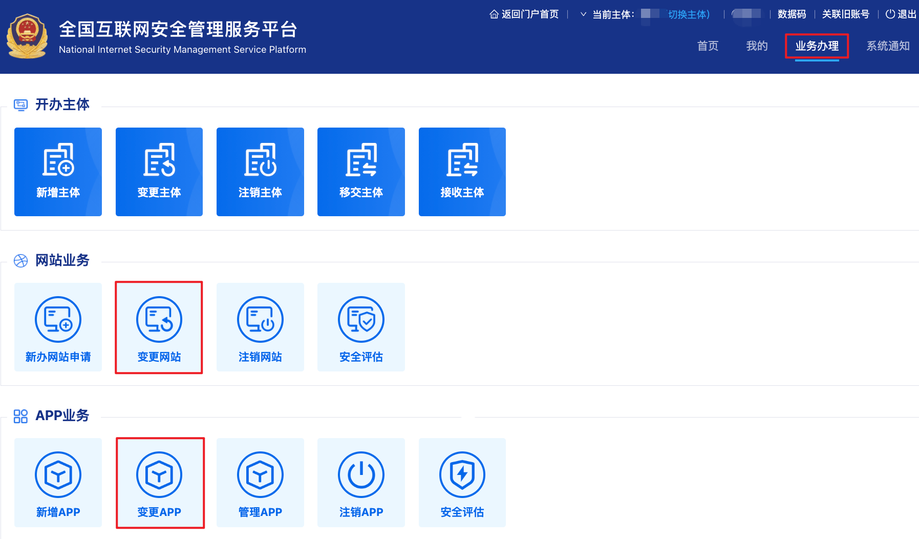 1. 请登录 全国互联网安全管理服务平台,单击业务办理 > 变更网站/变更 APP。进入网站或 APP 列表页面,列表数据为当前用户所有已经申请备案的网站/APP 数据,对于已通过审核的网站或APP,您可在该页面的操作列找到变更按钮,单击变更按钮,修改相应的信息后,重新提交审核。