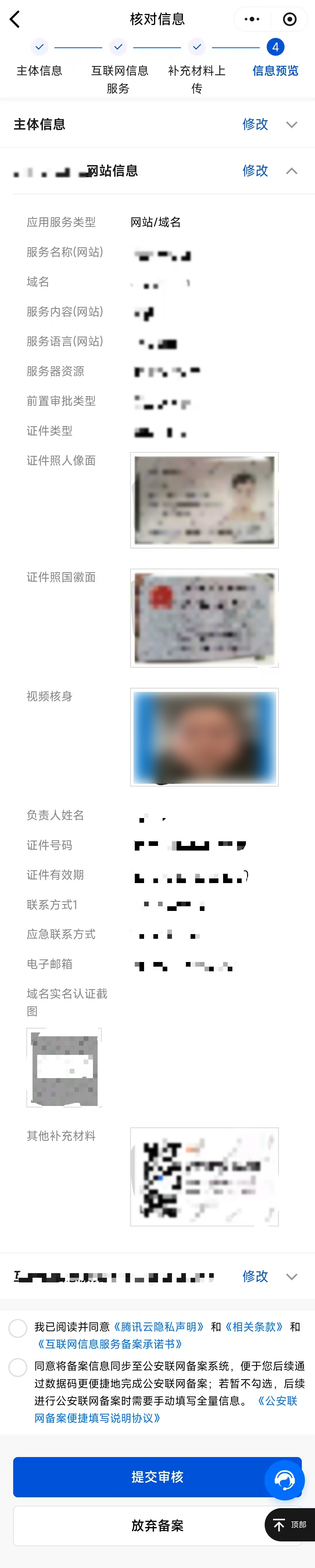1. 请仔细核对您的备案信息,确认无误后,阅读和勾选我已阅读并同意《腾讯云隐私声明》、《相关条款》、《互联网信息服务备案承诺书》,若您同意将备案信息同步至公安联网备案系统,请勾选《公安联网备案便捷填写说明协议》,然后单击提交审核,如下图所示: