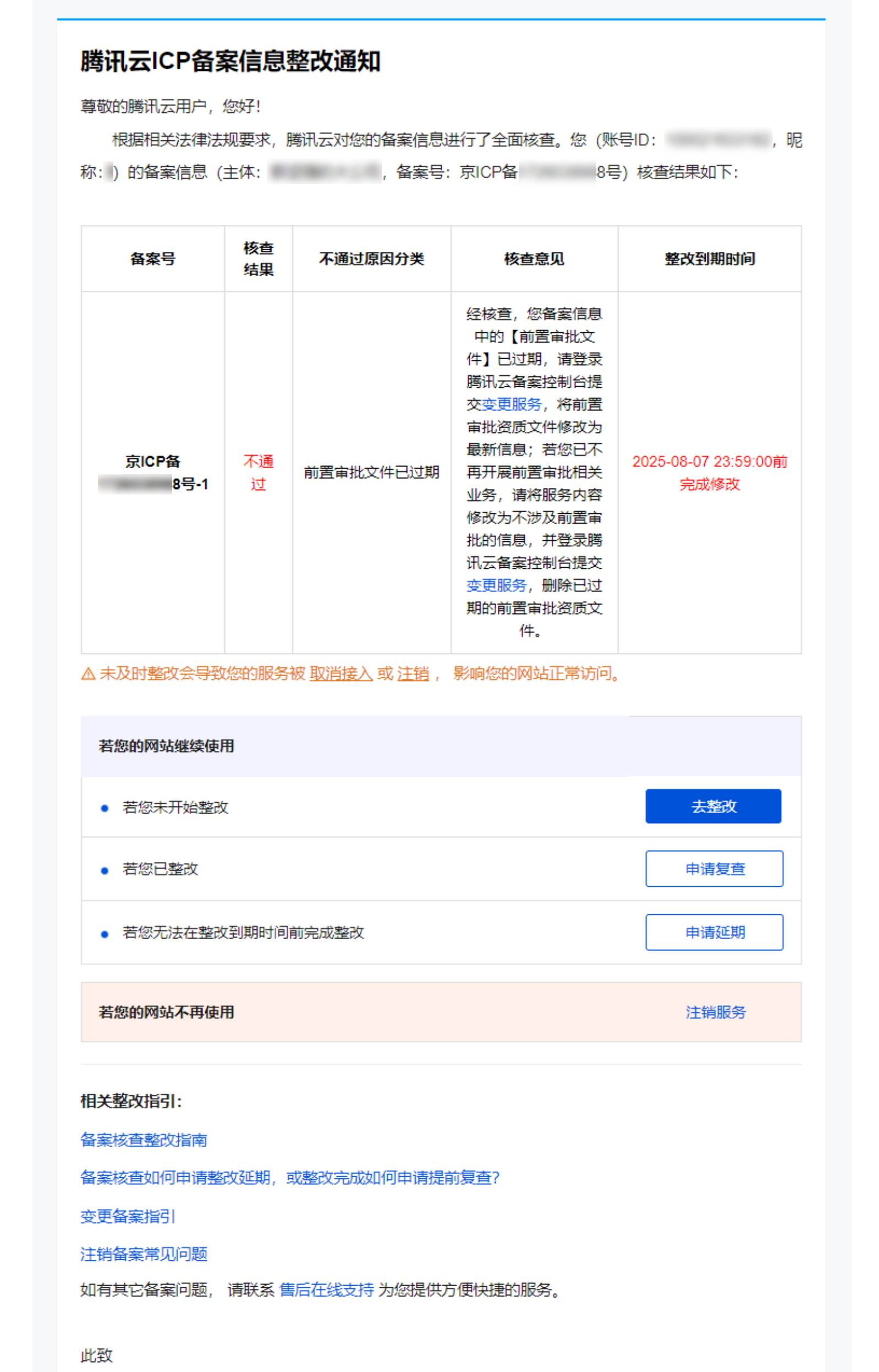如您收到整改通知邮件,您可单击邮件内的 备案控制台 查看具体问题及整改建议。邮件通知详情如下图所示: