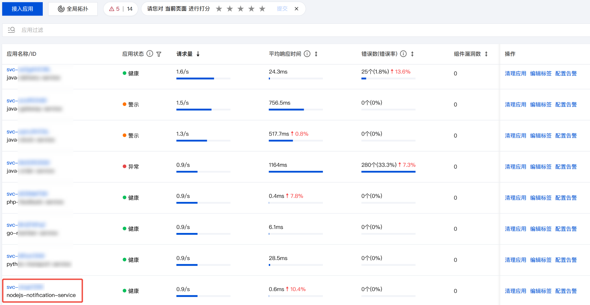 对工作负载添加 annotation 后,基于不同的发布策略,触发应用 Pod 的重启。新启动的 Pod 会自动注入探针,并连接到 APM 服务端上报监控数据,上报的业务系统为 Operator 的默认业务系统。在有正常流量的情况下,应用性能监控 > 应用列表 中将展示接入的应用,单击应用名称/ID 进入应用详情页。
