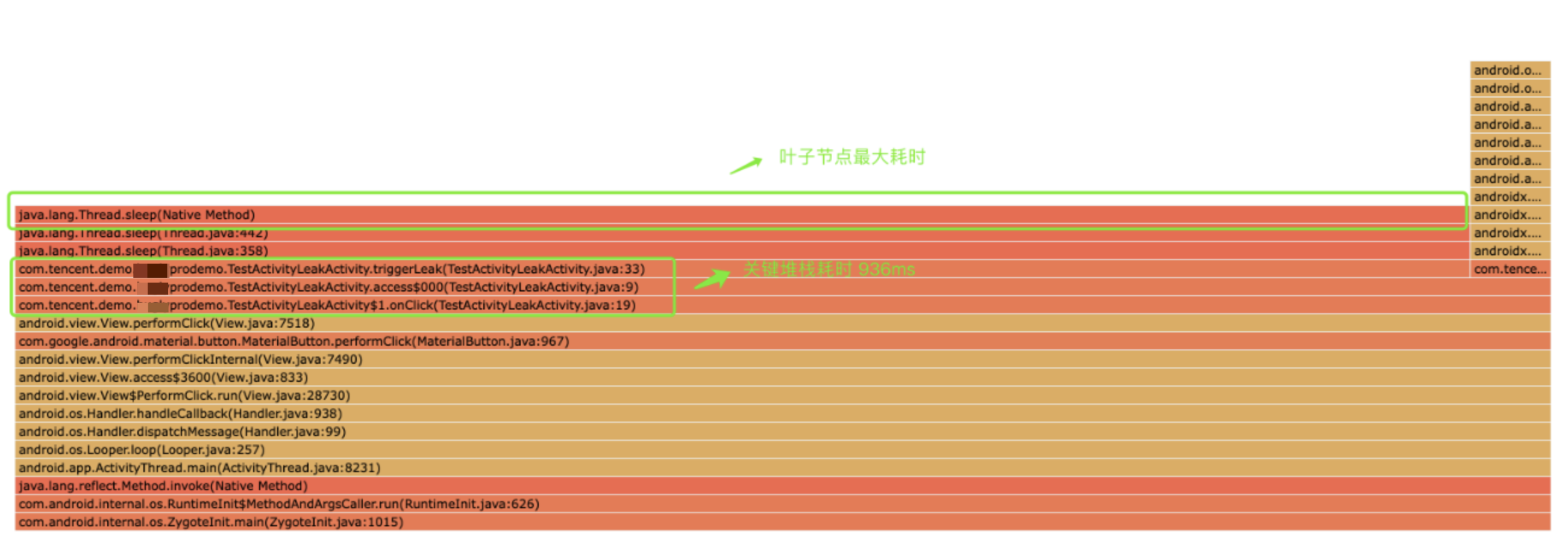 叶子结点最大耗时是指一个堆栈树,所有叶子结点中耗时最大的。如果一个卡顿问题,其叶子结点最大耗时比较大,甚至接近于关键堆栈耗时,说明叶子结点的堆栈就是卡顿的主要原因。像死锁,UI 线程执行 IO 操作,UI 线程访问 DB,往往叶子结点最大耗时会比较大。
