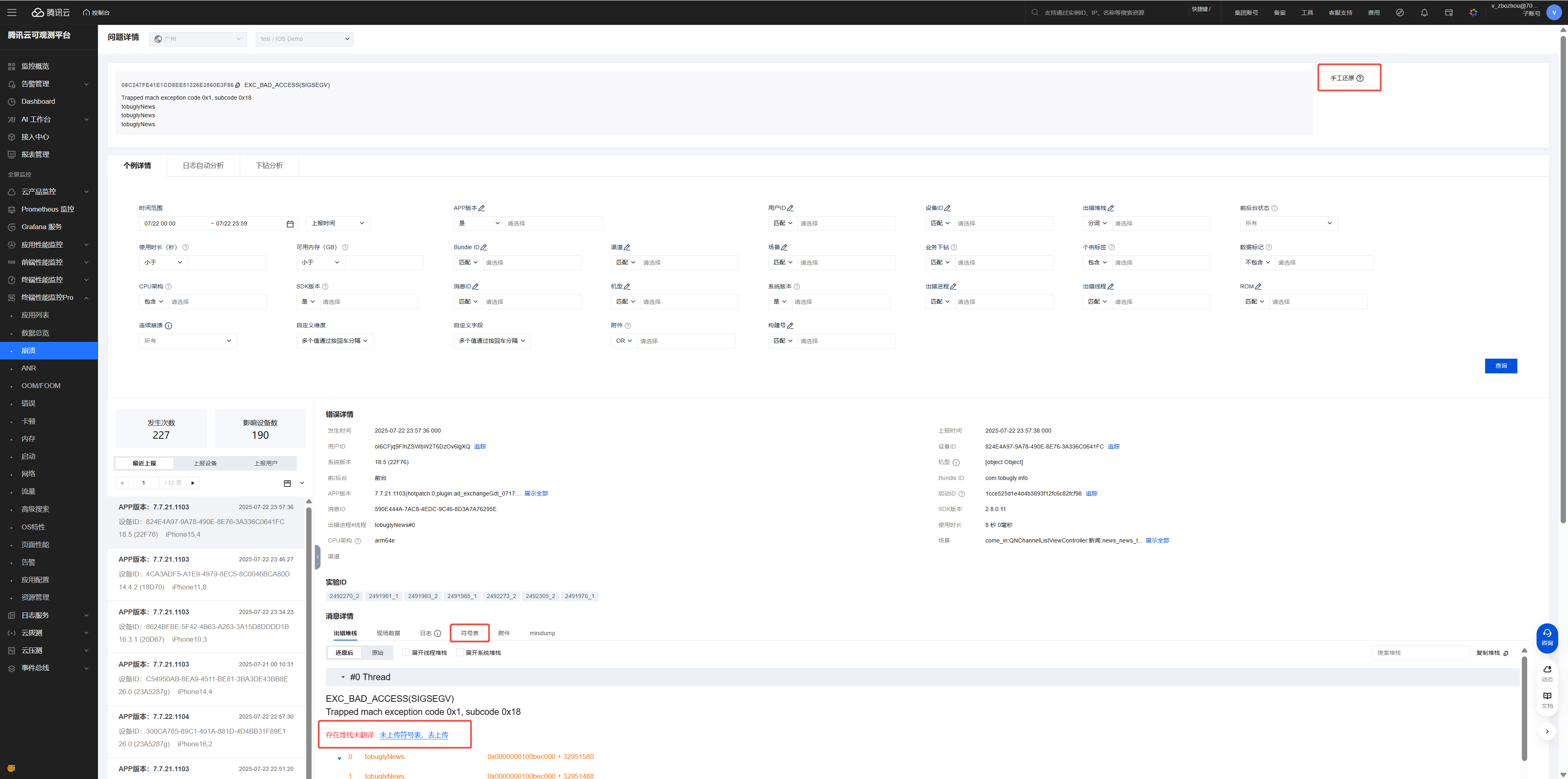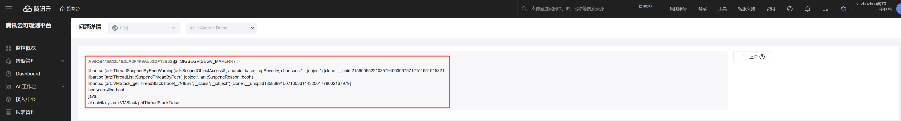2. 确认符号表上传成功后,单击问题详情顶部的手工还原进行堆栈重还原。