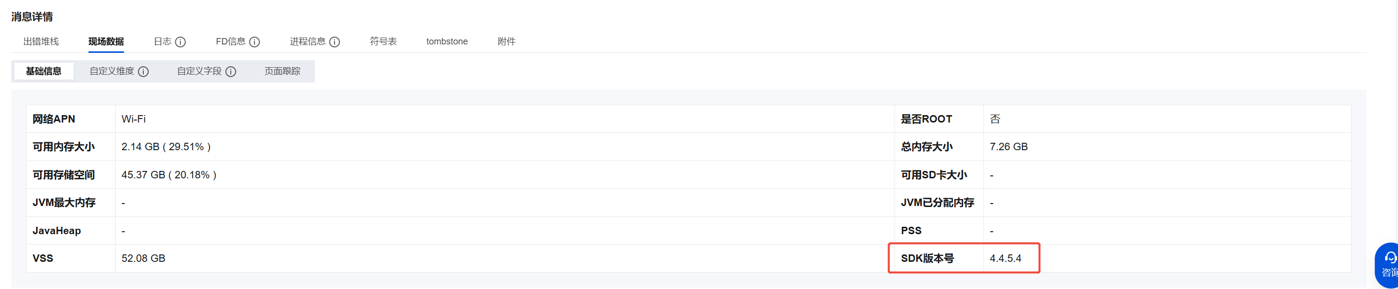 可以先通过筛选条件过滤 App 版本,找到当前 App 版本的一条上报个例,在上报个例的现场数据中,可以找到 SDK 版本号字段,即可知道当前集成的 SDK 版本号。