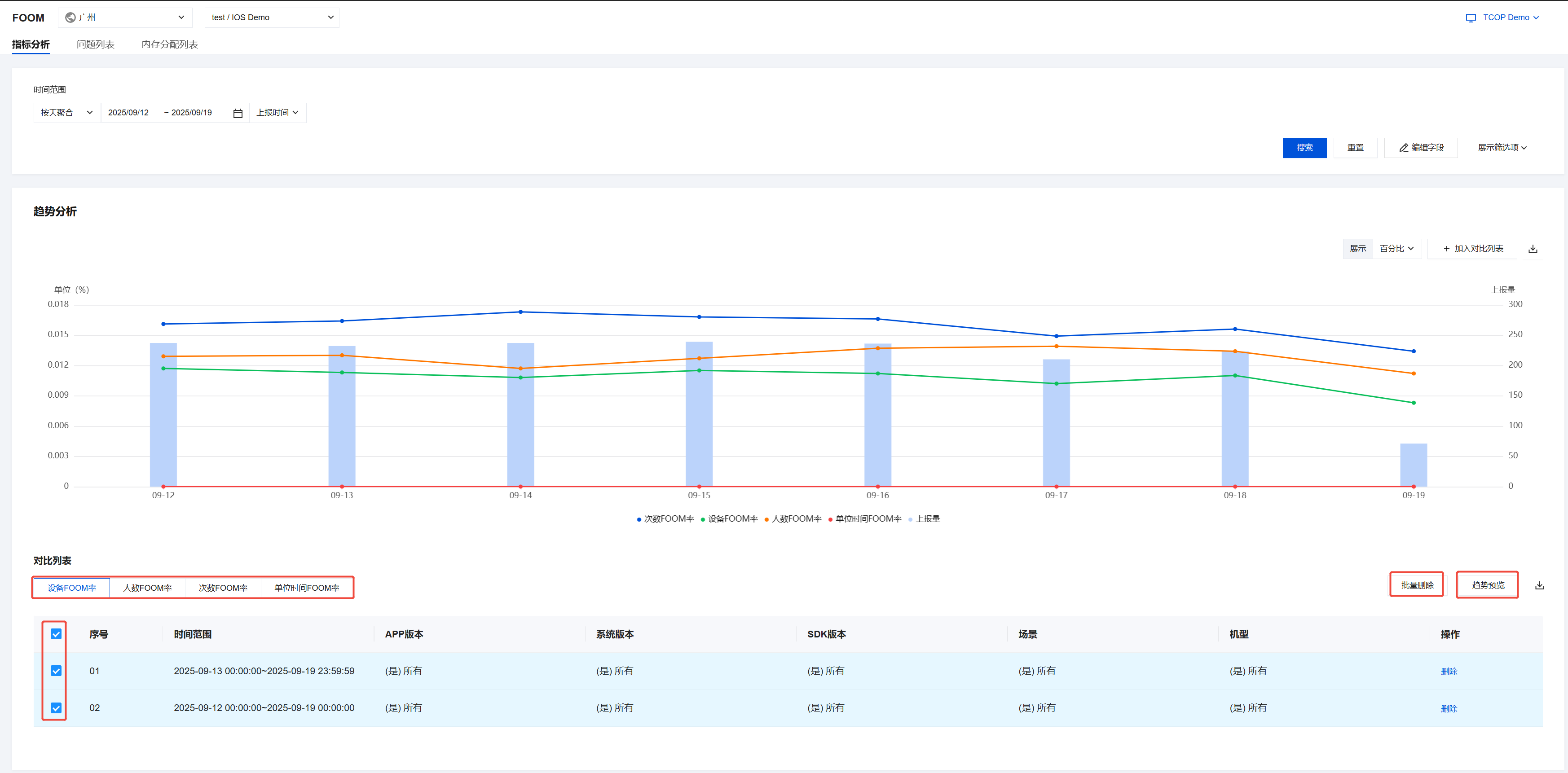 对比列表区域可查看不同筛选条件下的 FOOM 相关数据明细,包括序号、时间范围、APP 版本等信息,还可进行删除、批量删除、趋势预览等操作。