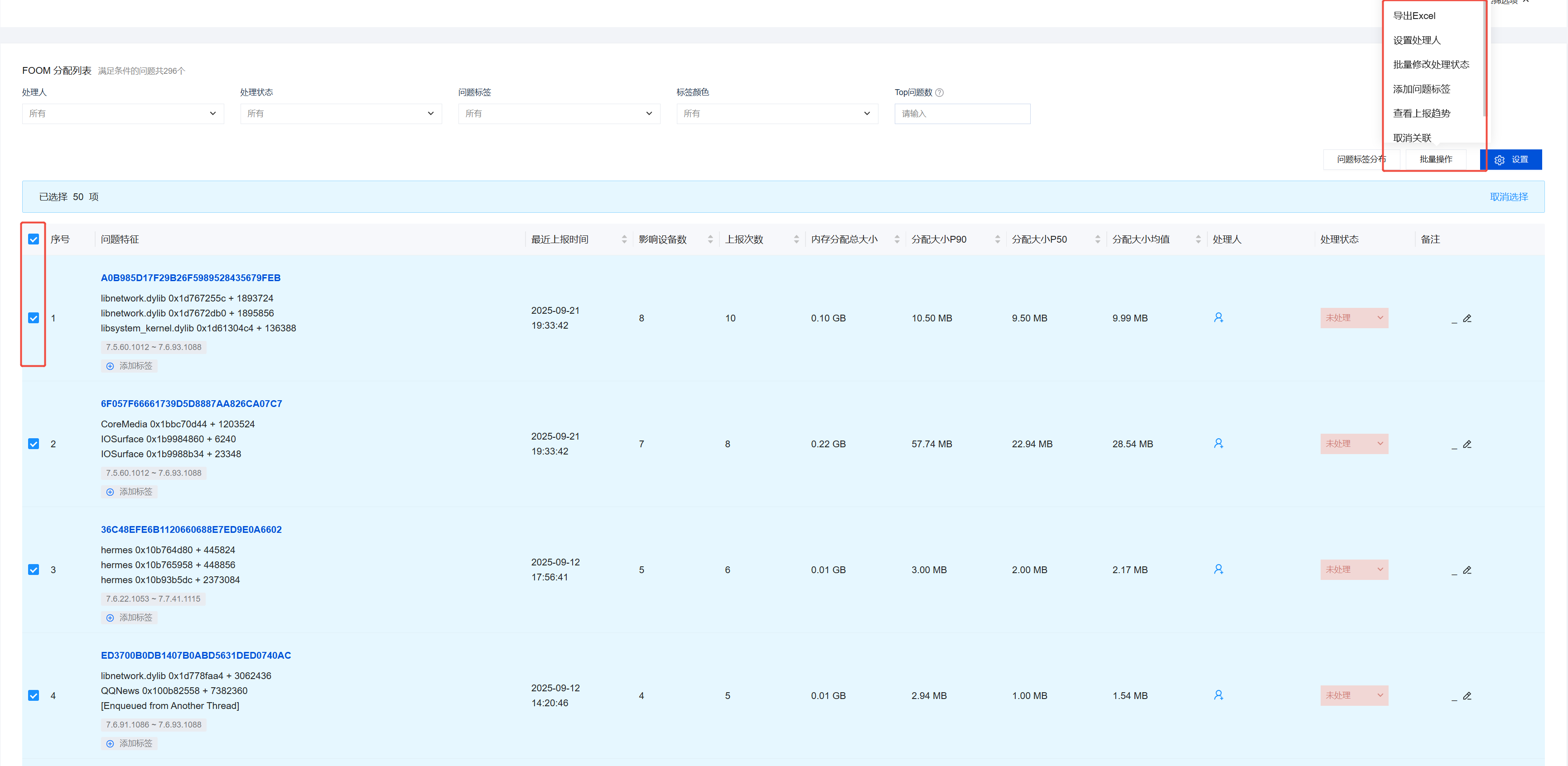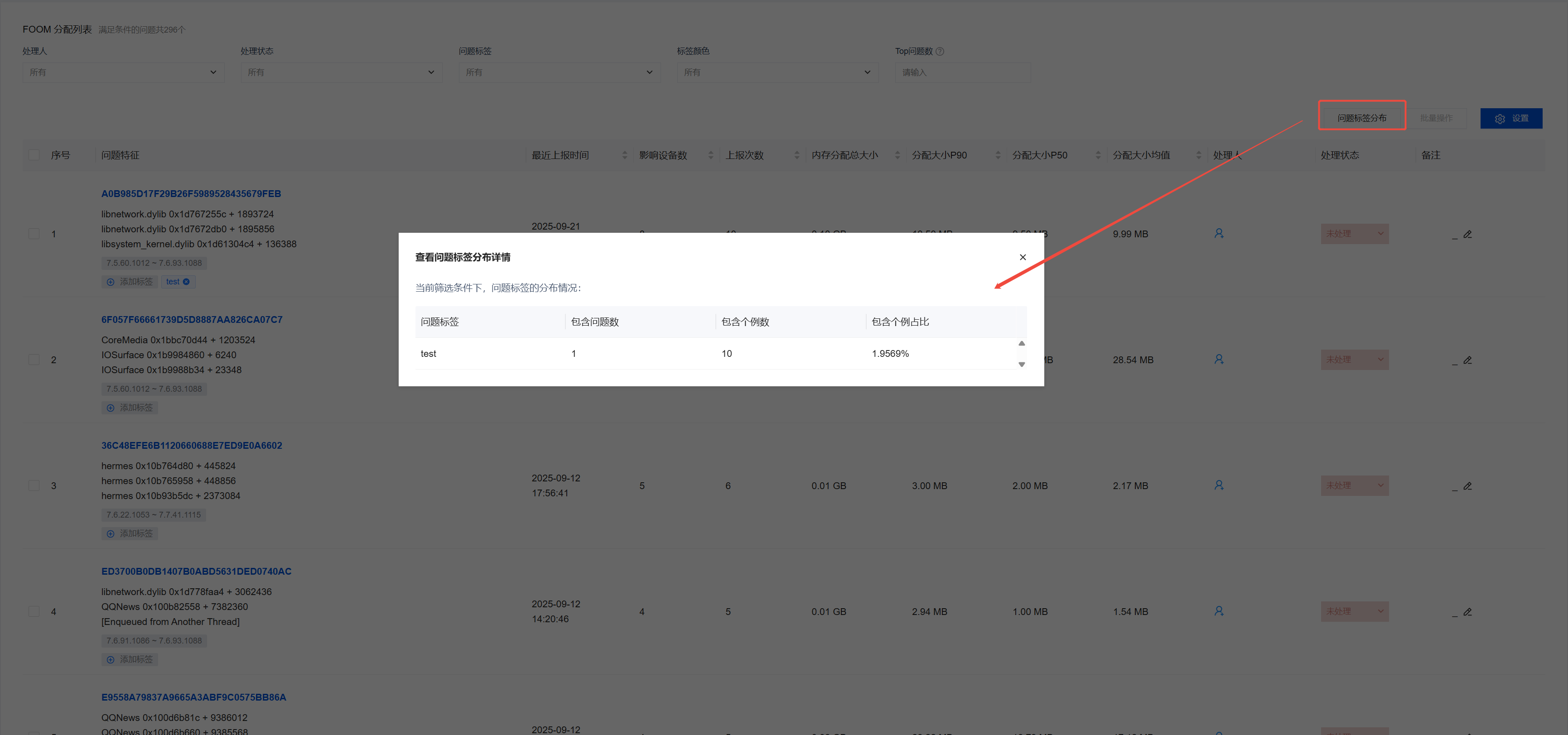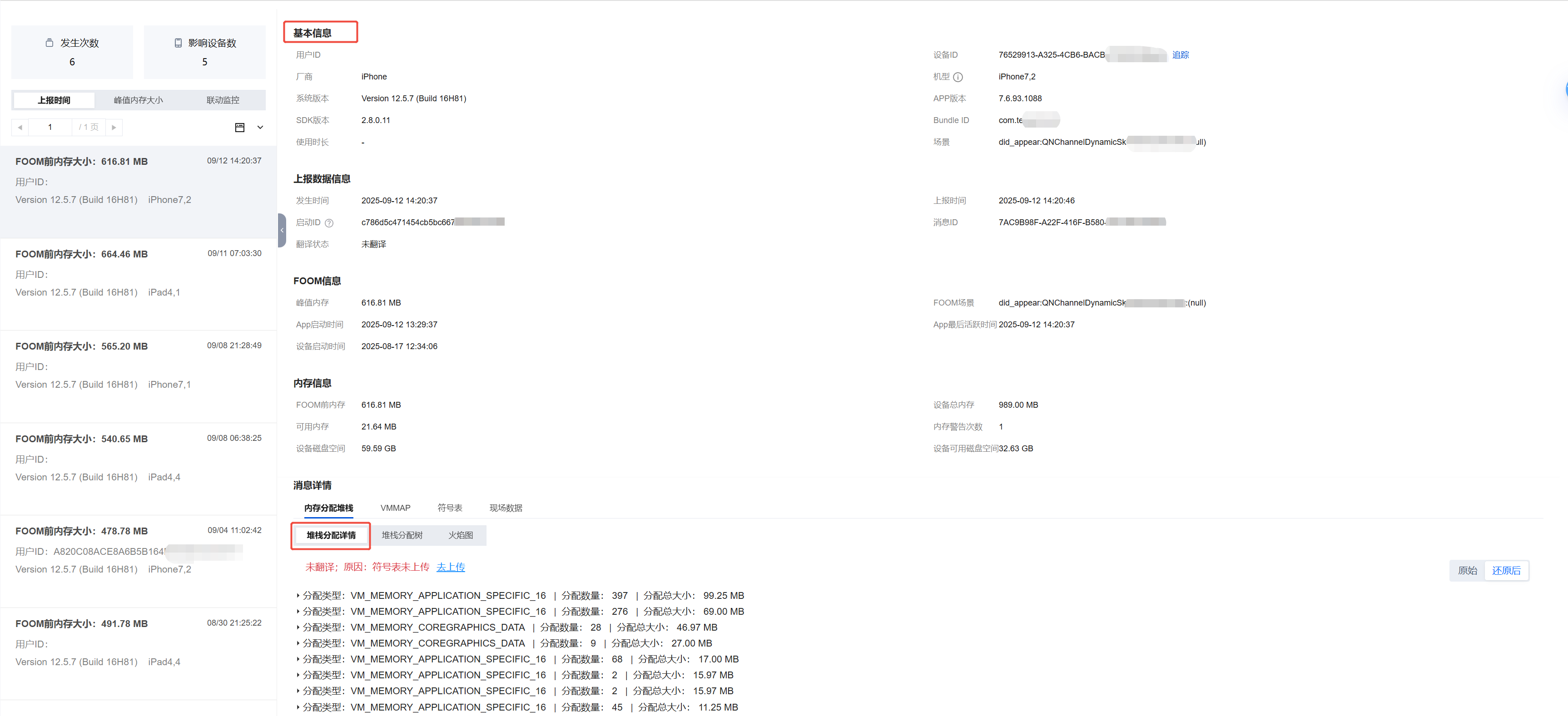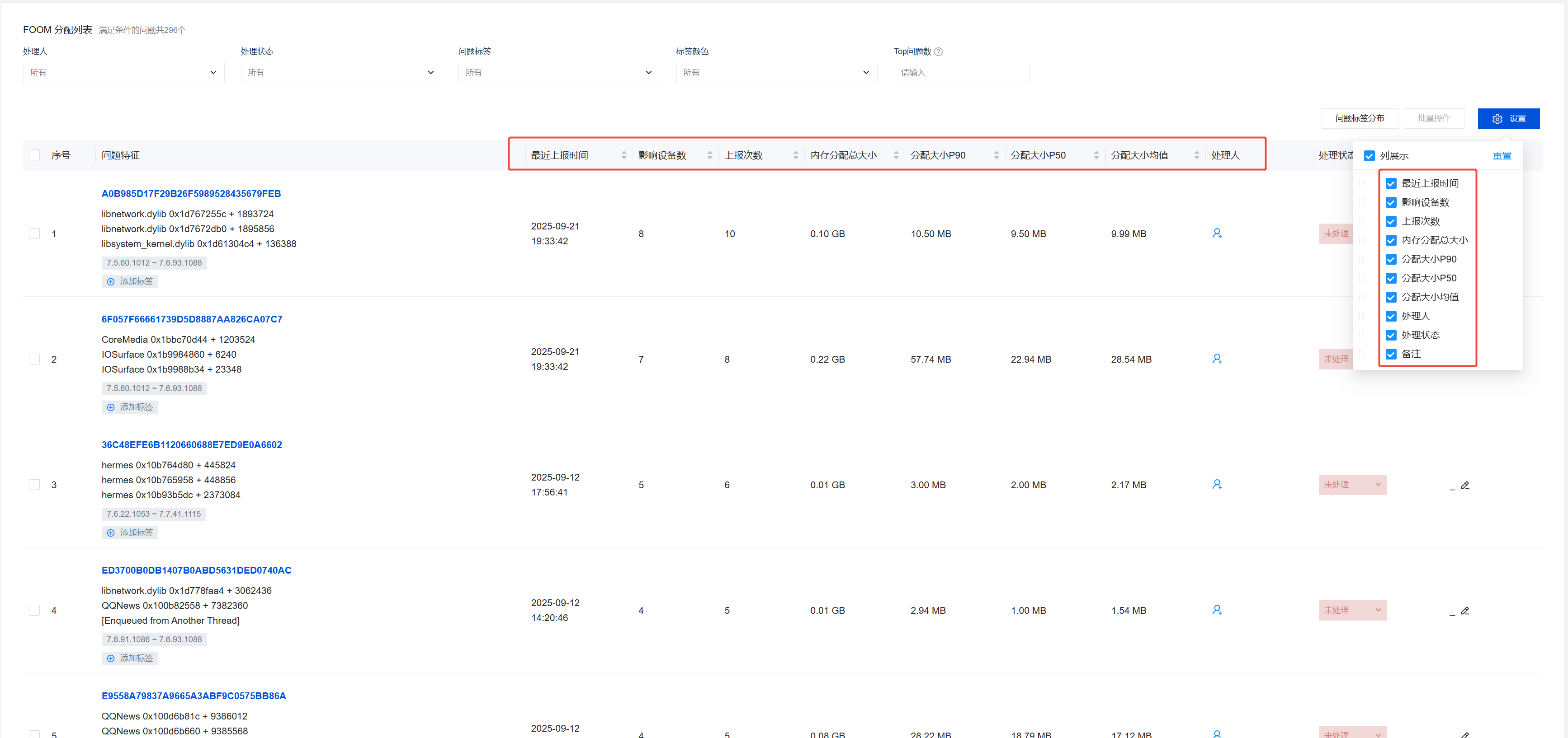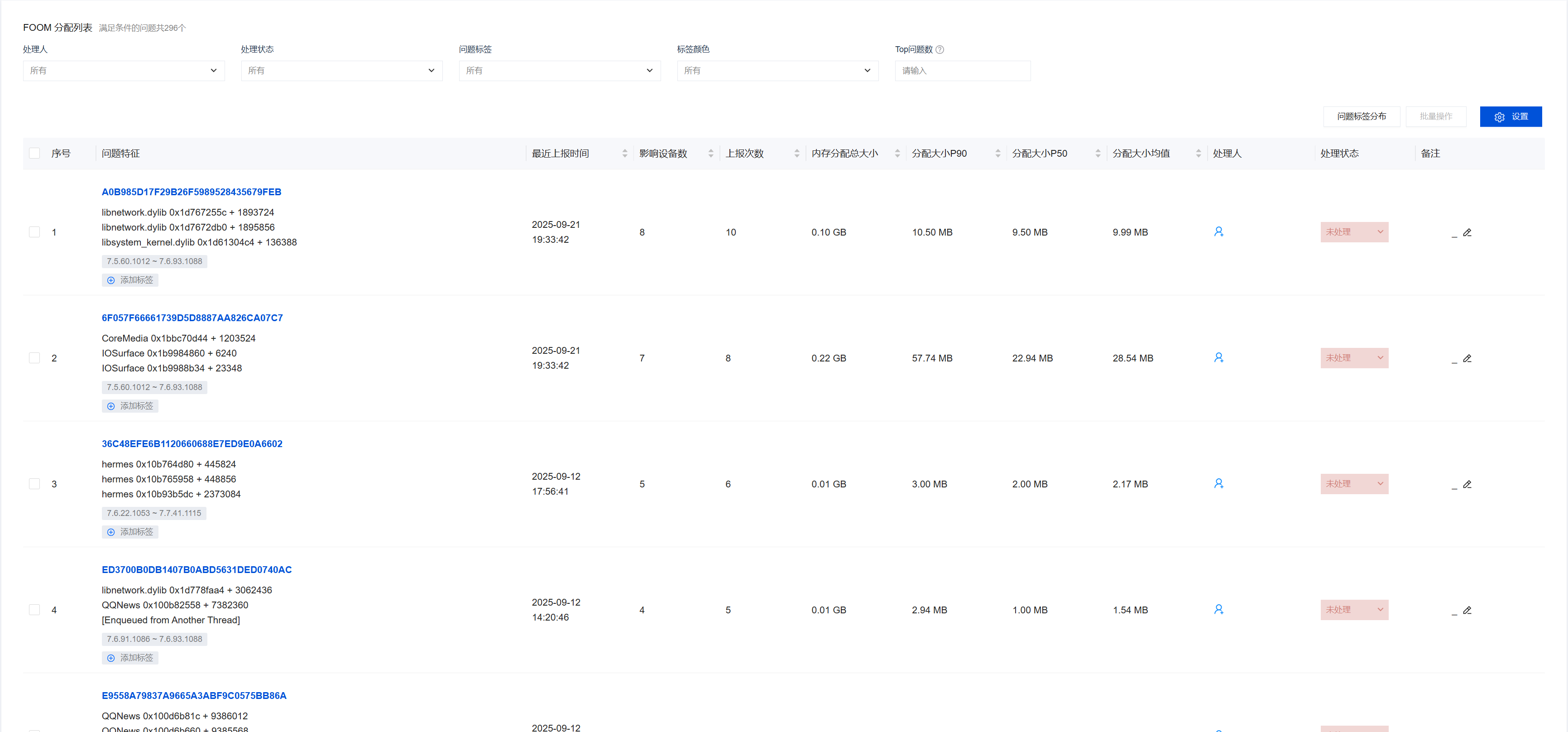 用户查询以后查询结果会在 FOOM 分配列表中展示,包括问题特征、最近上报时间、影响设备数、上报次数、内存分配总大小等信息。