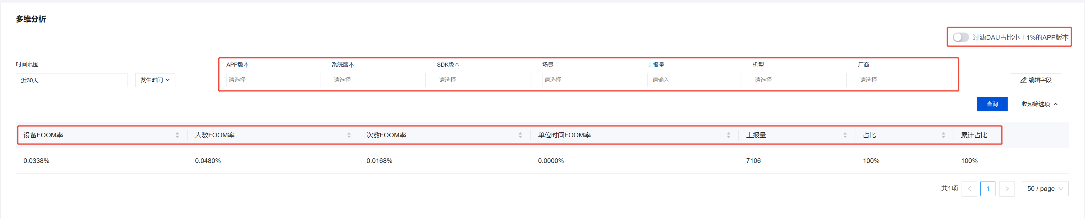 数据展示:该区域会展示设备 FOOM 率、人数 FOOM 率、次数 FOOM 率、单位时间 FOOM 率、上报量、占比、累计占比等多维度的 FOOM 相关数据,帮助用户从不同角度分析 FOOM 指标情况。