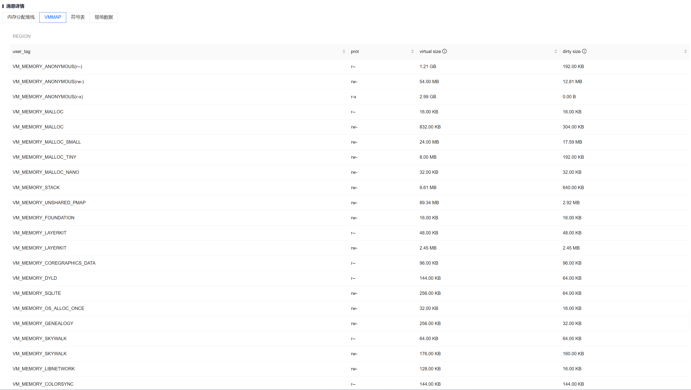 在上述记录策略外的内存问题,堆栈分配详情可能无法直接提供有效信息,因此后续引入了 VMMAP 数据。VMMAP 数据类似 vmmap 命令的输出,提供的是内核管理的内存信息的使用情况,包括 user_tag、virtual_size、dirty_size 等信息。
