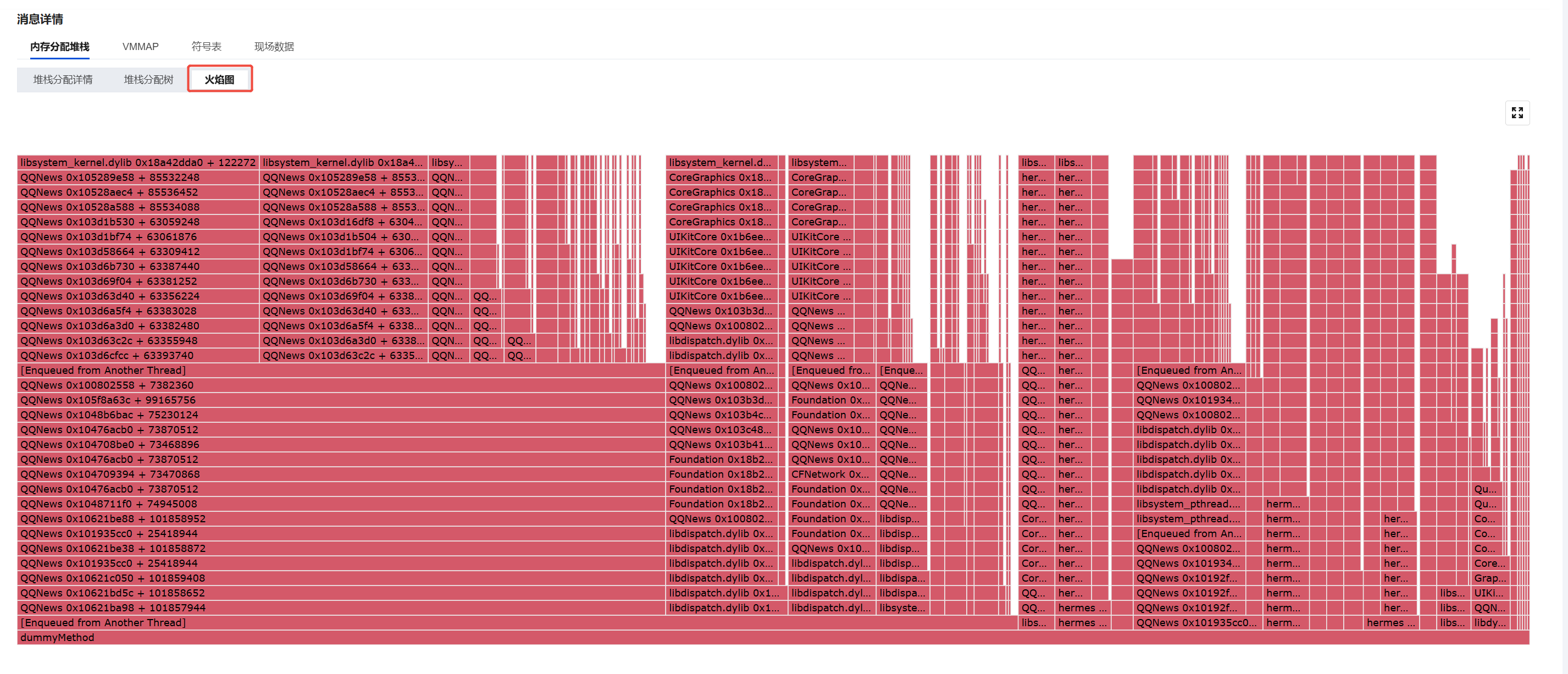 堆栈分配树和火焰图是对堆栈分配详情中的堆栈数据进行聚合产生的数据,其没有特殊含义,只是通过聚合为树结构后,可以更直观的发现内存分配的占比等情况。