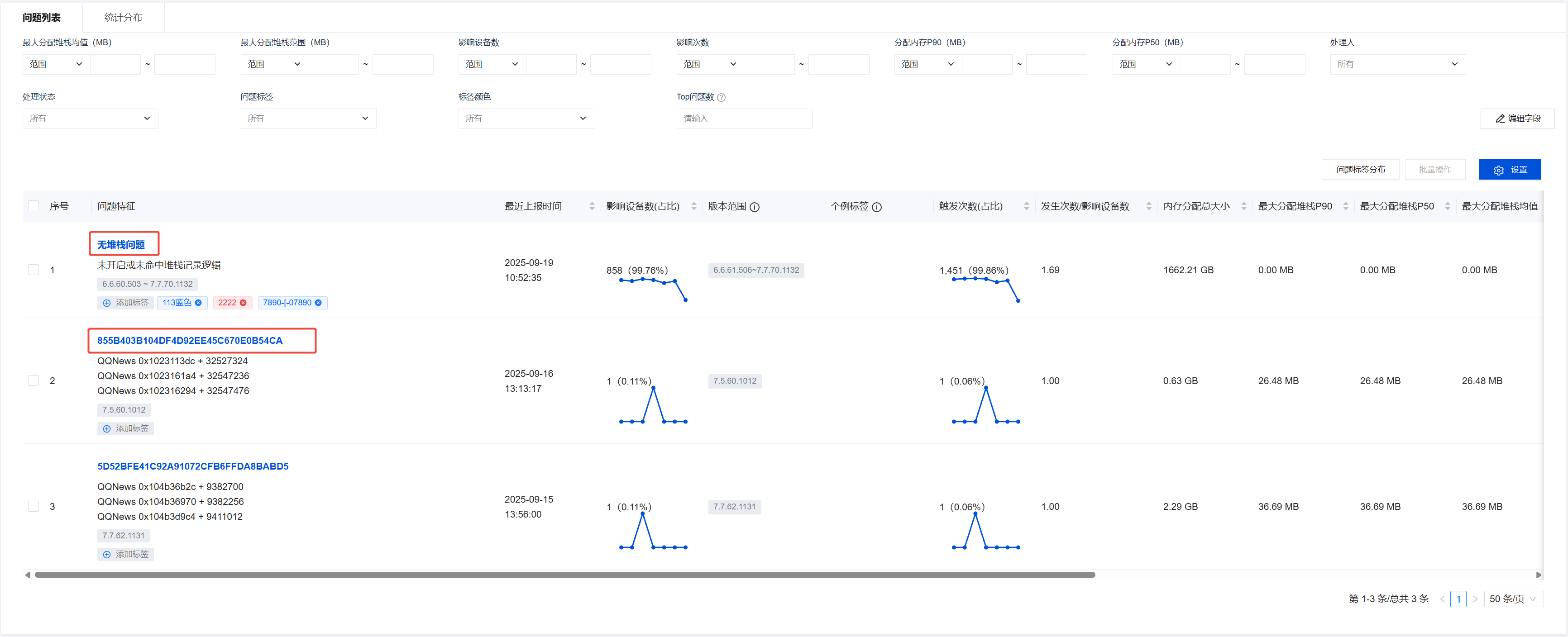 由于开启堆栈的占比较少,因此绝大部分的个例问题,都会被聚类在无堆栈问题中。