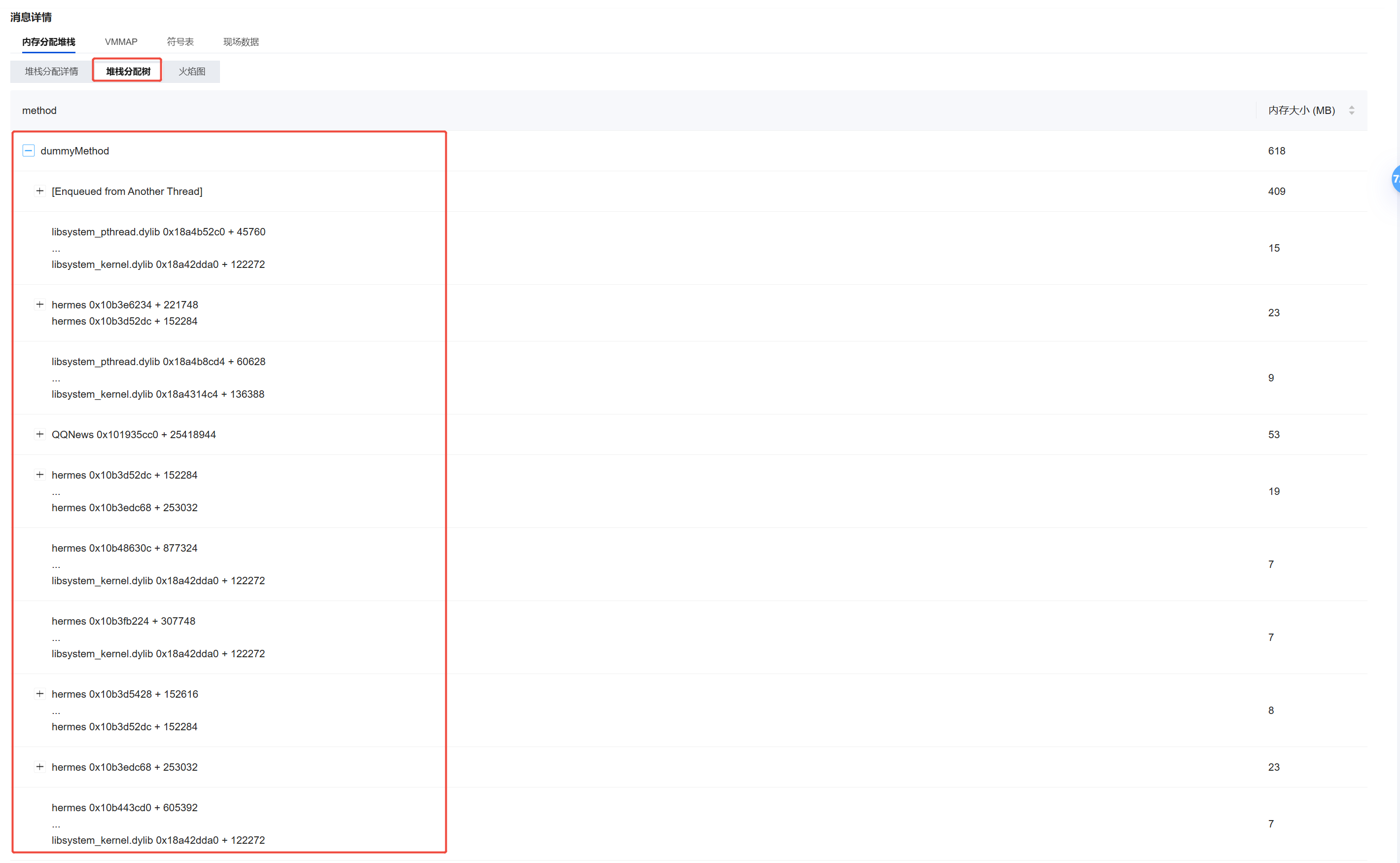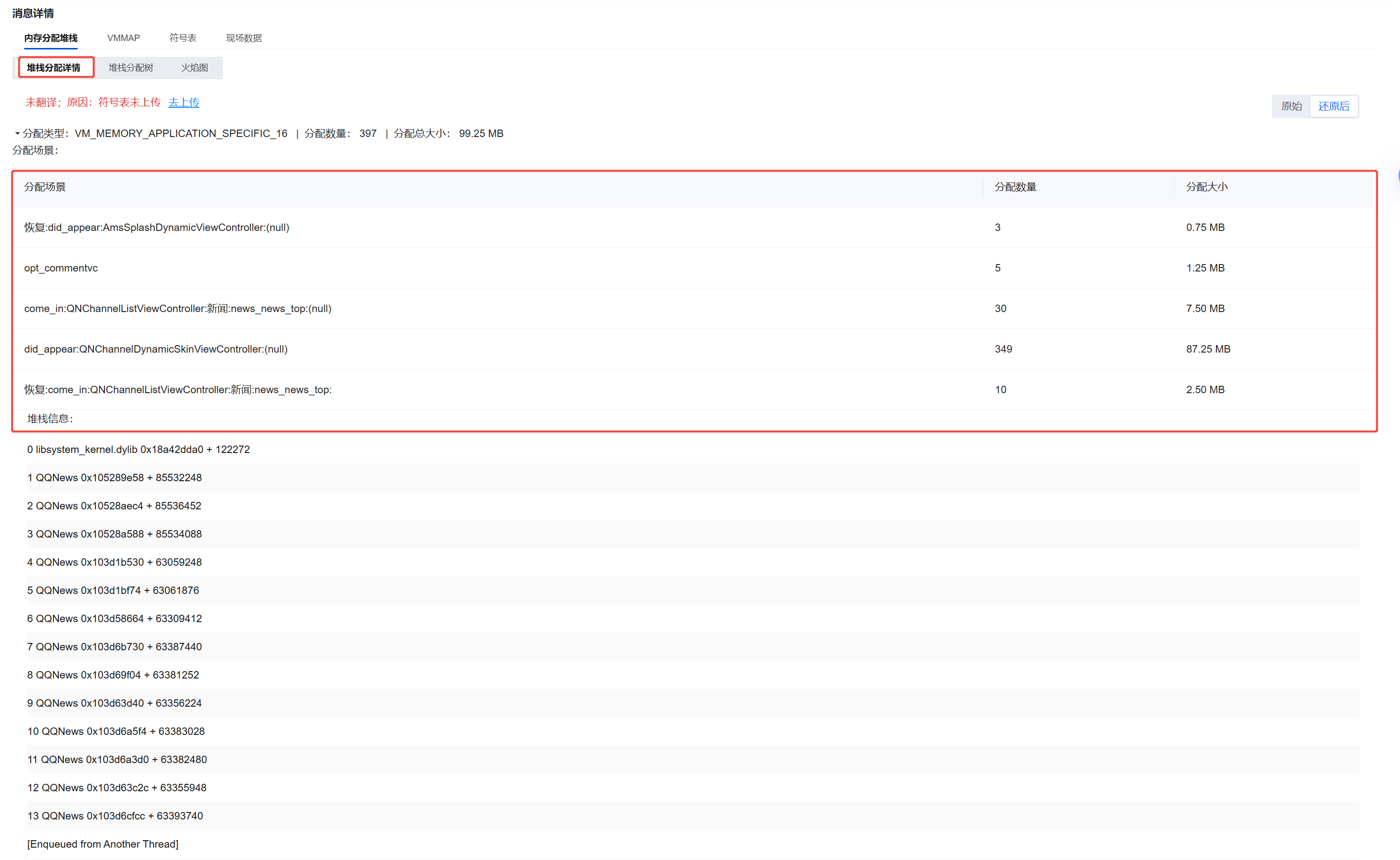 堆栈分配详情中的数据便是 SDK 收集的 App 在运行过程中记录到的 malloc logger 信息。