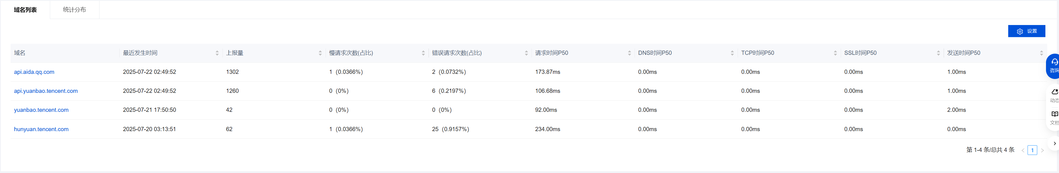 除了整体趋势外,我们可能比较关注,部分域名和接口的数据。此时,可以使用多维下钻来完成。点击期望分析的域名,或者接口,即可在右侧查看指定域名/接口的数据。