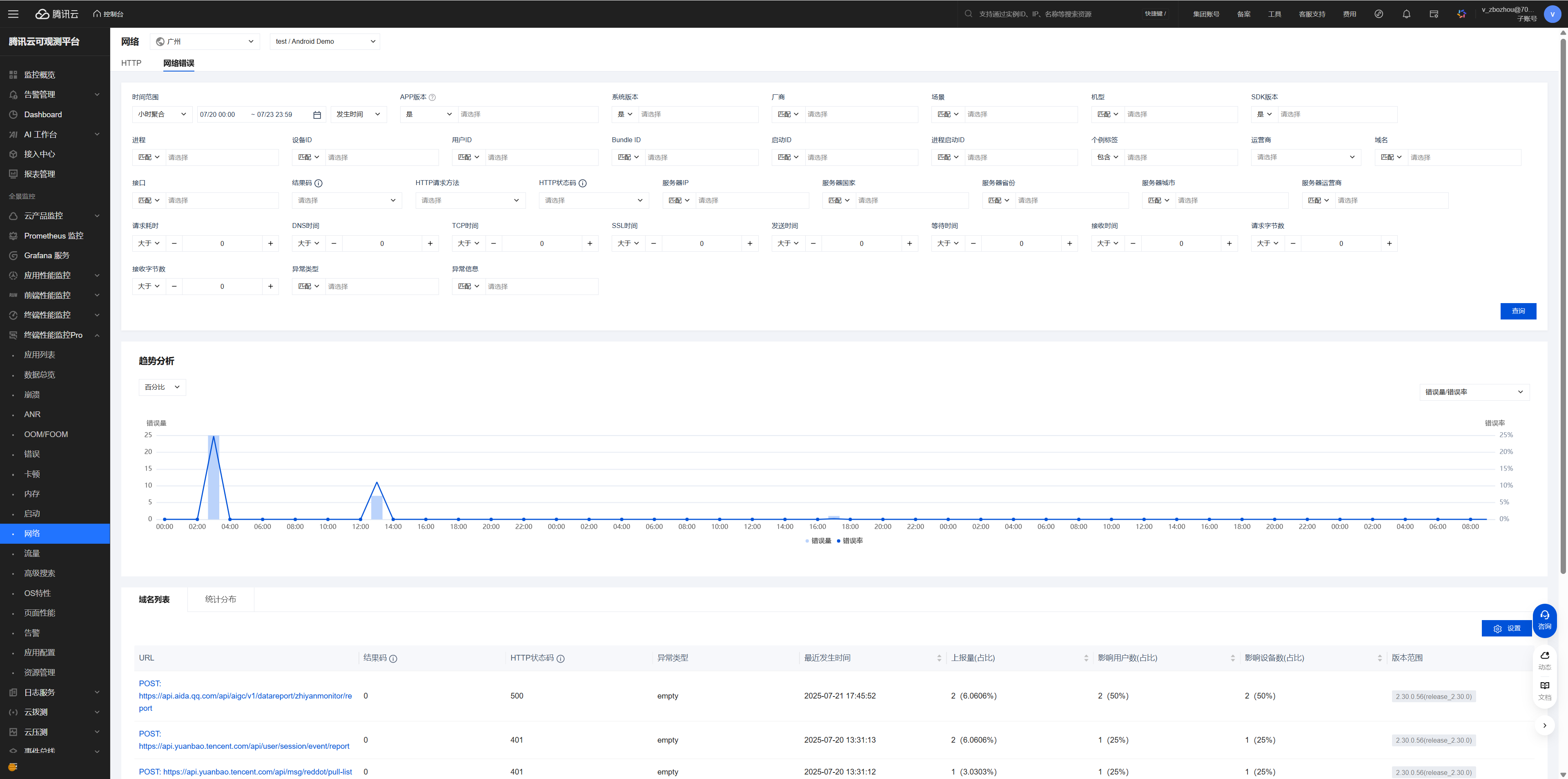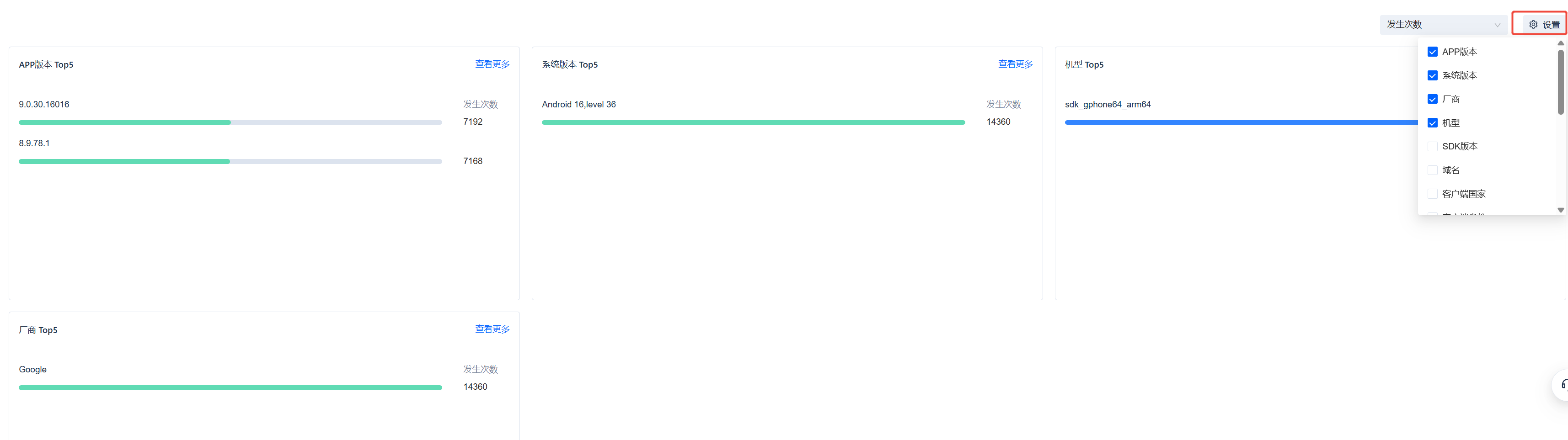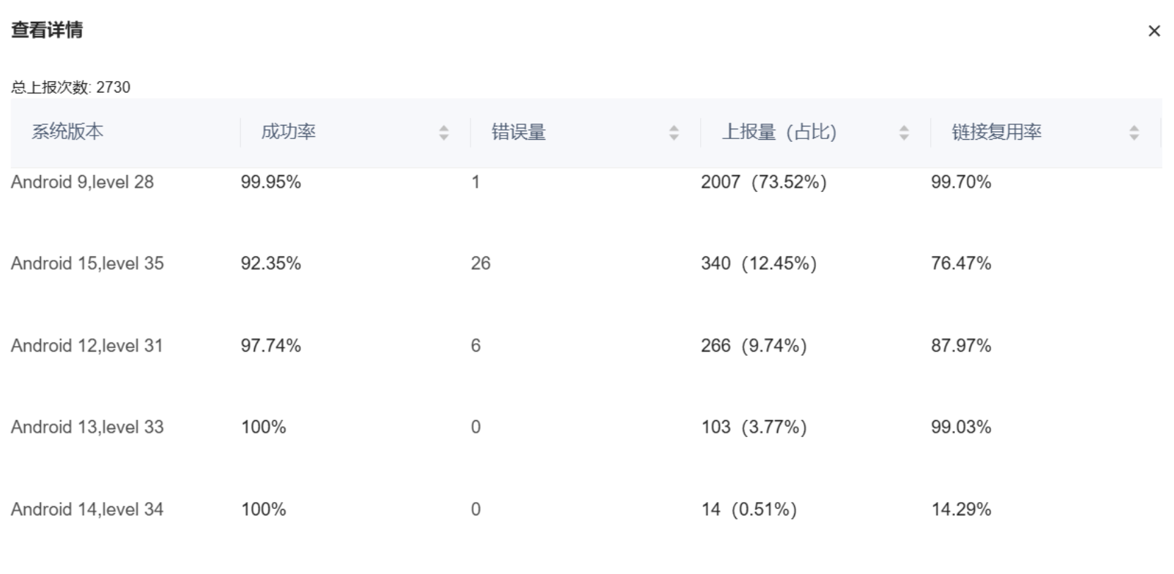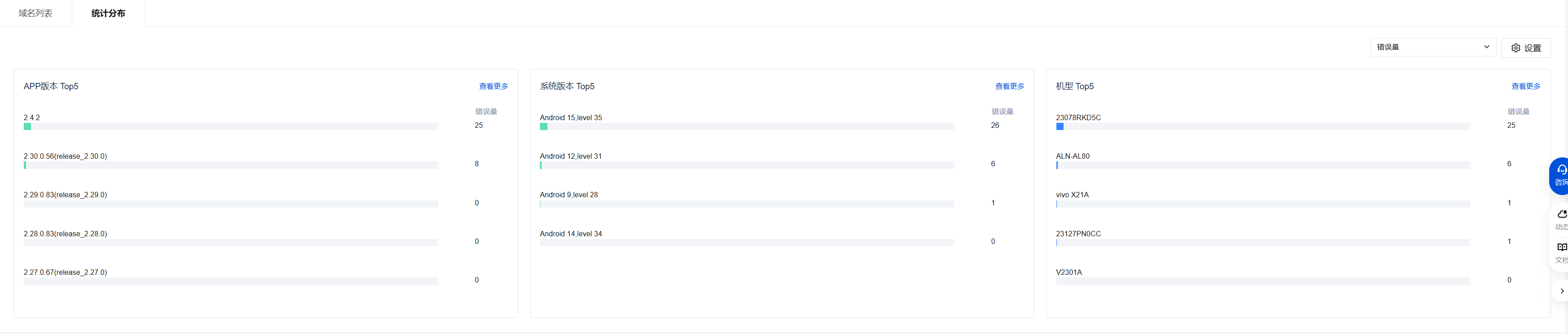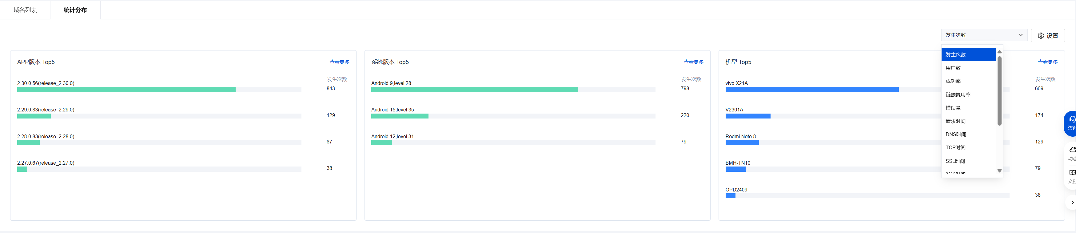 统计分布:与 HTTP 类似,网络错误也提供丰富的下钻字段,方便用户分析各维度的上报占比。