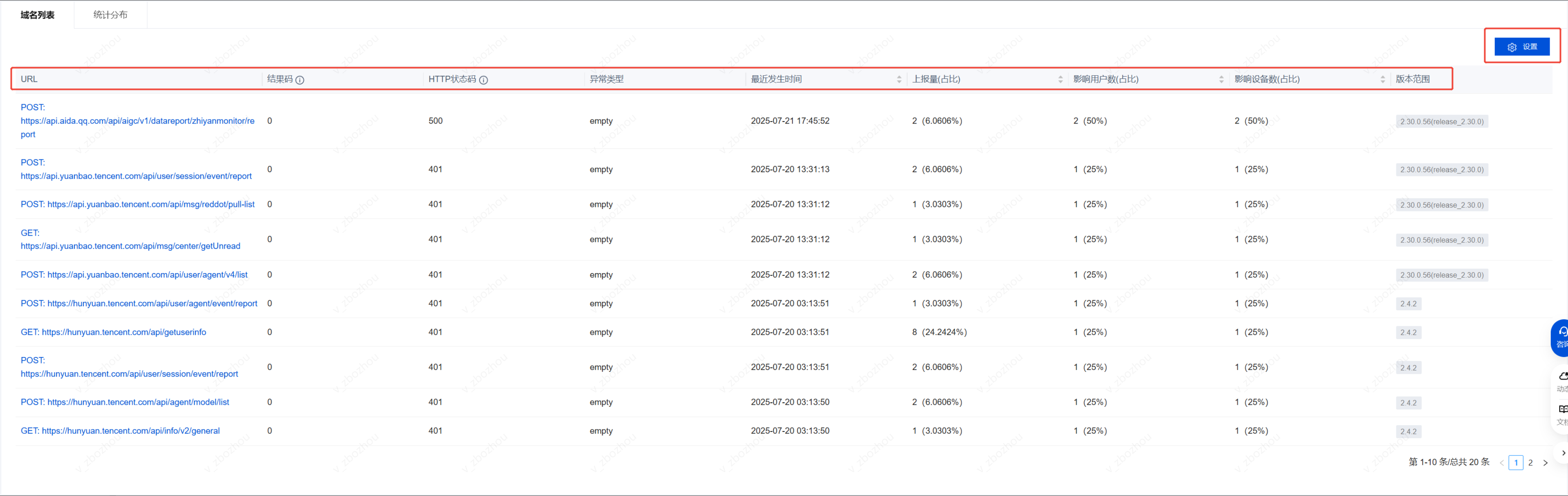 HTTP 方法 + 域名 + 接口 + 错误码进行聚类,列表支持展示 URL、结果码、HTTP 状态码等多个维度,可单击 设置进行字段的设置。