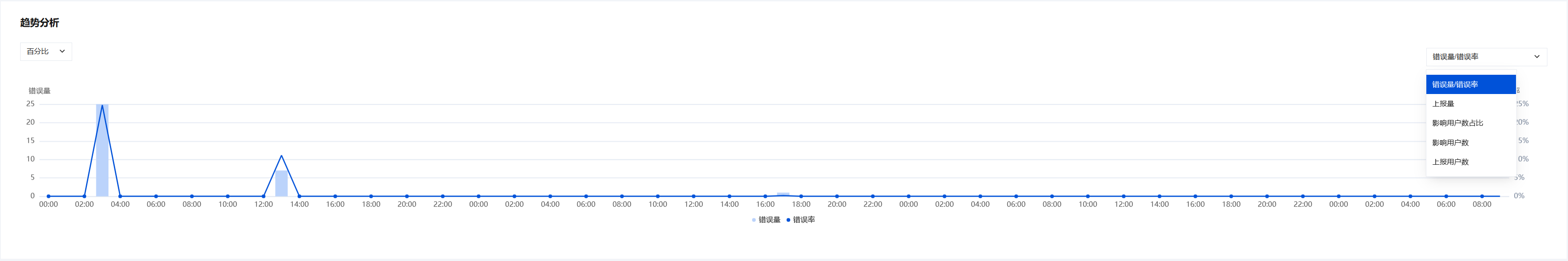 趋势分析中支持错误量 / 错误率、上报量、影响用户数占比、影响用户数、上报用户数等多个指标,用户可按需选择展示 。