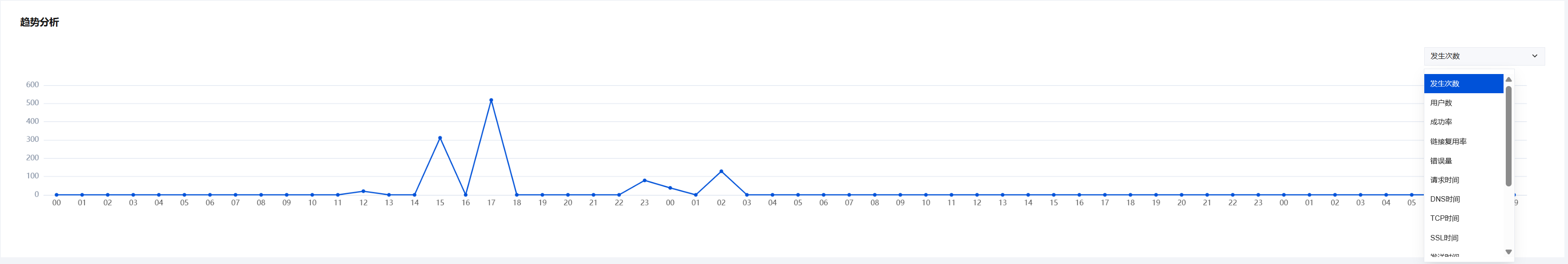 趋势分析中,支持发生次数、用户数、成功率、链接复用率等多项指标,用户可根据自己的需求来选择相应的指标查看分析图。