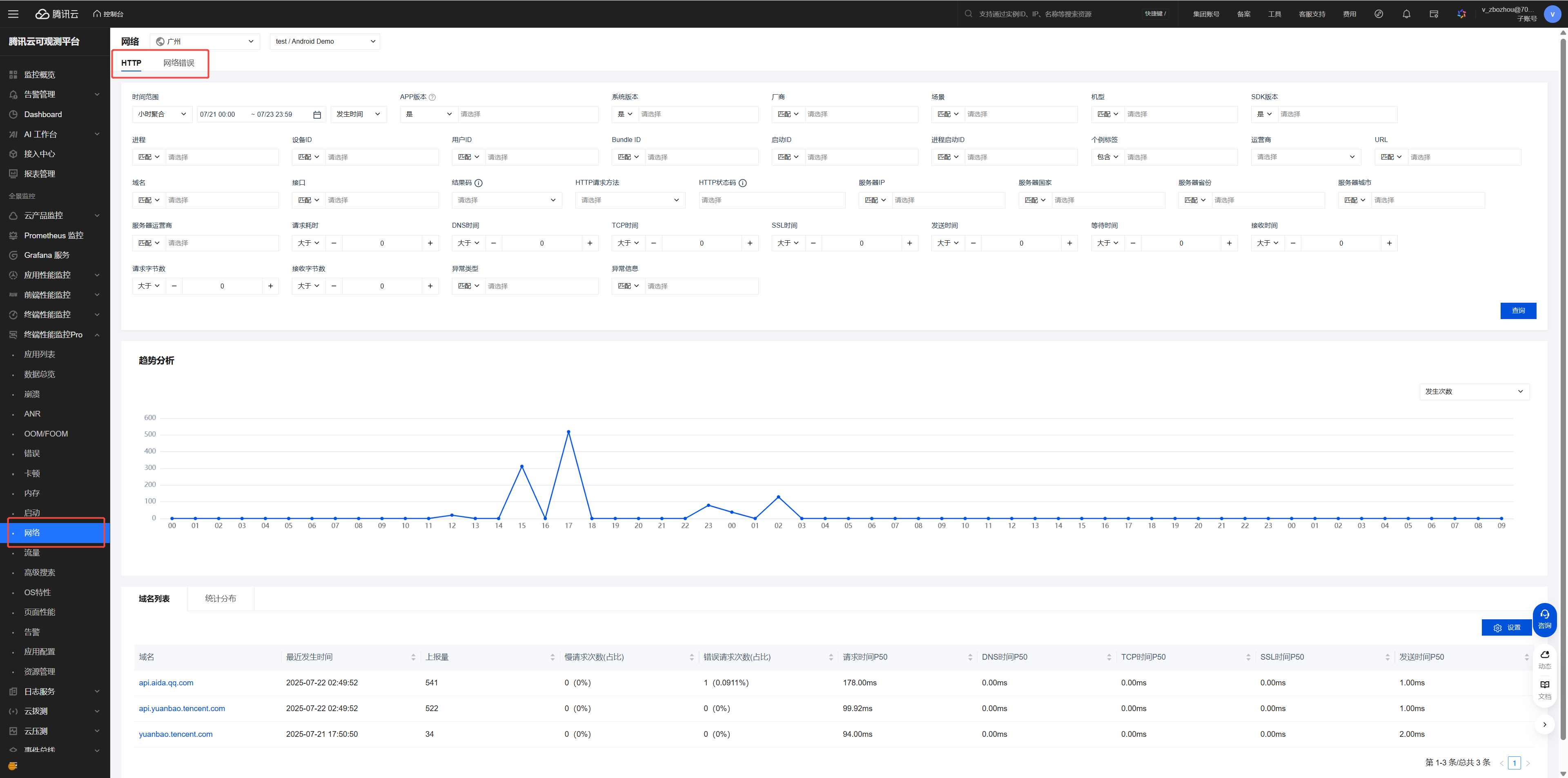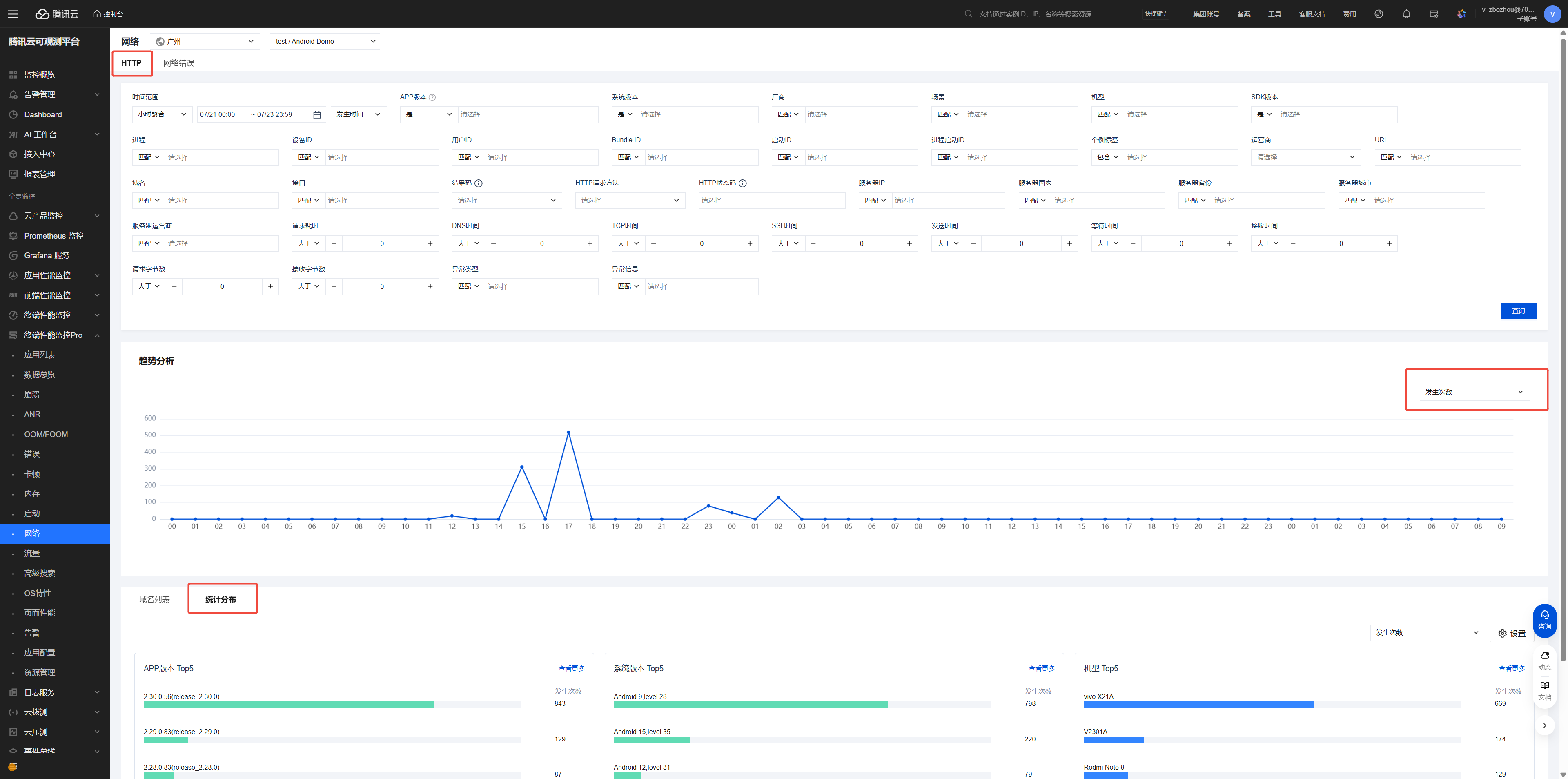 HTTP 模块包含所监控到的所有 HTTP 请求的质量数据,如成功率、请求耗时、重要阶段耗时、传输数据大小等。