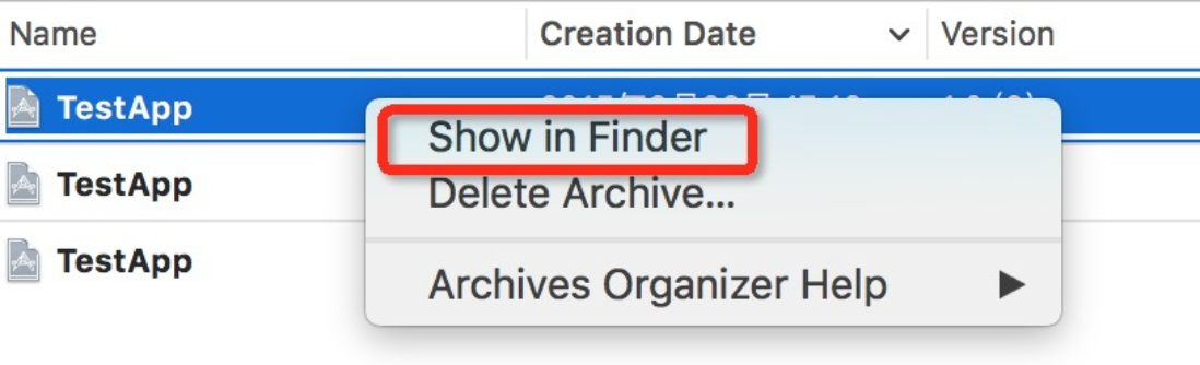 3. 找到发布的归档包,右键点击对应归档包,选择 Show in Finder 操作。